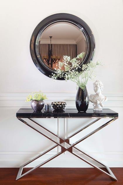 สำหรับใครที่ไม่อยากวางอะไรบนคอนโซล แต่อยากให้มุมนี้ดูโดดเด่นลองใช้ไอเดียนี้ดูค่ะ ไอเดียนี้เหมาะกับบ้านที่มีผนังห้องสูง 3 เมตรขึ้นไป ถ้าคอนโซลมีพื้นผิวมันวาว การเลือกสิ่งของที่มีผิวมันเงาและสะท้อนแสงไฟได้ดีอย่างกระจกเงาหรือกรอบรูปมาตกแต่งที่ผนังด้านหลัง จะช่วยให้มุมนี้ดูน่าสนใจได้ไม่น้อย แนะนำให้เลือกกระจกเงาที่มีดีไซน์เก๋ๆและมีลูกเล่น ทั้งแบบทรงกลมและสี่เหลี่ยม มาผสมผสานกับกรอบรูป