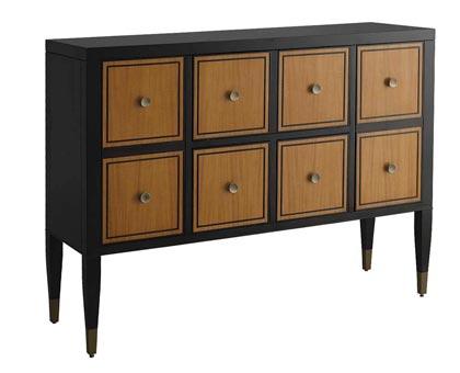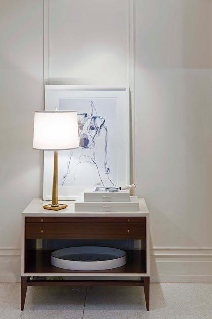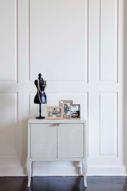 โดยเลือกโคมไฟรูปทรงเรียบง่าย มีโครงสร้างดูบางตาแต่โดดเด่นด้วยวัสดุที่เนี้ยบและหรู ส่วนผนังด้านหลังติดกรอบรูปโทนสีขาว-ดำตรงกึ่งกลาง ให้สมดุลกับโคมไฟทั้ง 2 ด้าน การติดรูปควรติดให้อยู่ในระดับสายตา สูงจากท็อปตู้ 50 - 60 เซนติเมตร วางกล่องหนังทรงเหลี่ยมให้ซ้อนกันบนตำแหน่งตรงกลางตู้ หรือจะวางหนังสือแทนก็ได้