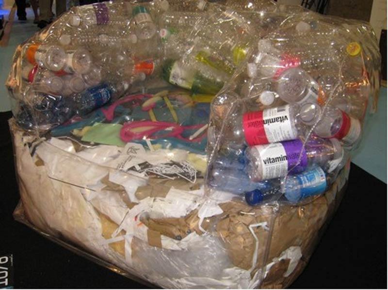 มีมากมายมหาศาลจริงๆ สำหรับขวดพลาสติก ซึ่งเป็นขยะที่ยากต่อการย่อยสลาย จะให้เผาก็กลายเป็นมลพิษทางอากาศอีก ความคิดที่นำขวดพวกนี้มาแปลงร่างเป็นเก้าอี้ก็เข้าท่าดีเหมือนกัน เพราะด้วยสีสันของฉลาก และรูปทรงที่มีหลากหลาย เลยได้เฟอร์นิเจอร์เก๋ๆ ไปใช้แต่งบ้านอีก 1 ชิ้น