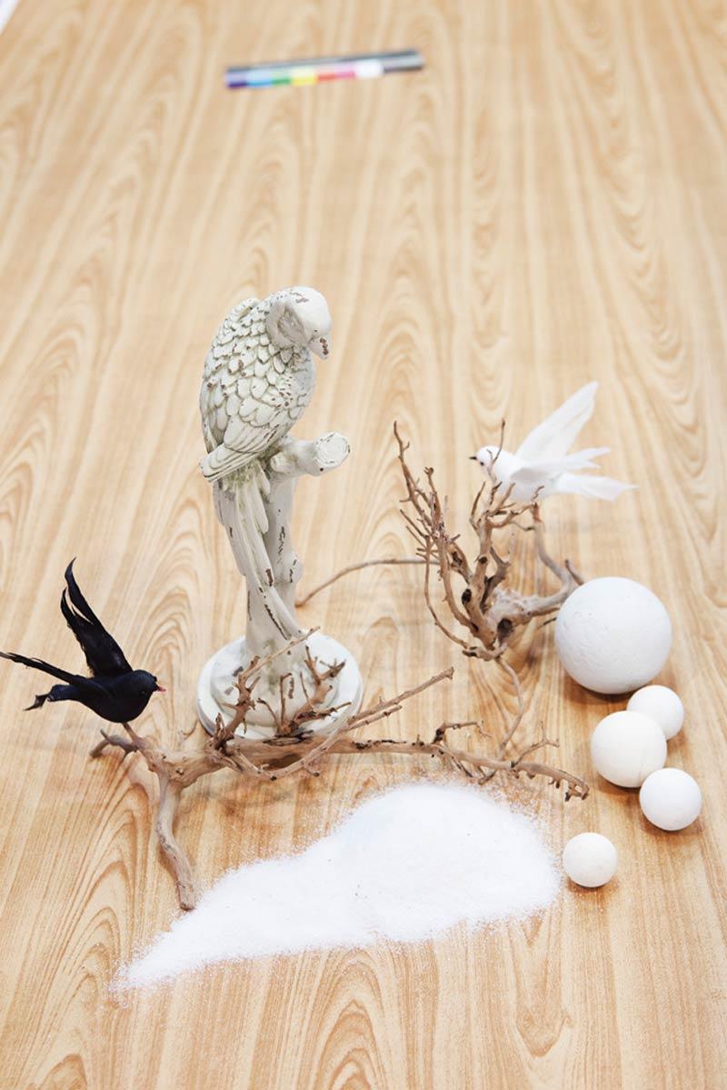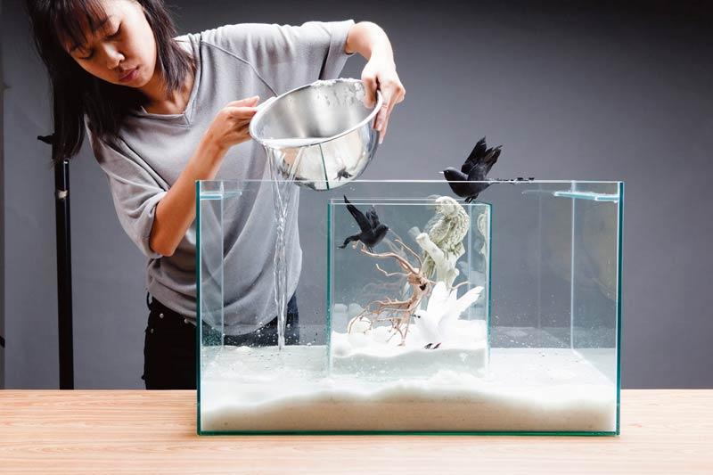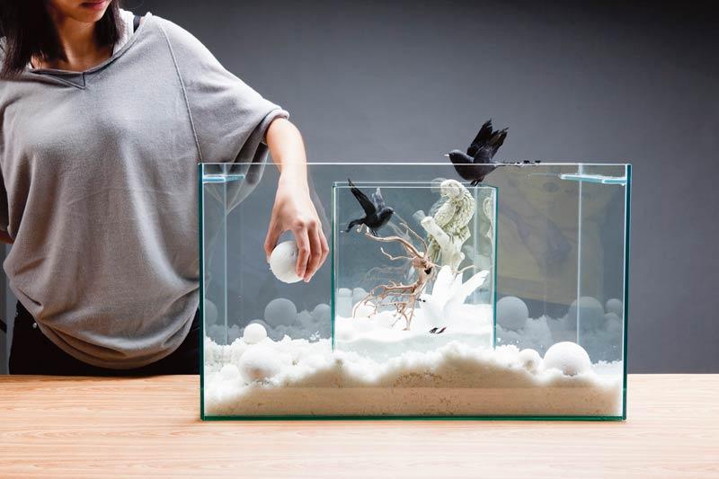 2. จัดตกแต่งตู้ใบเล็กด้วยการเททรายขาวและประดับก้อนหินลงไป เพื่อช่วยถ่วงน้ำหนักไม่ให้ตู้ใบเล็กลอยขึ้นมาขณะเติมน้ำลงในตู้ใบใหญ่ เพิ่มเรื่องราวและความน่าสนใจด้วยนกปลอมและกิ่งไม้แห้ง