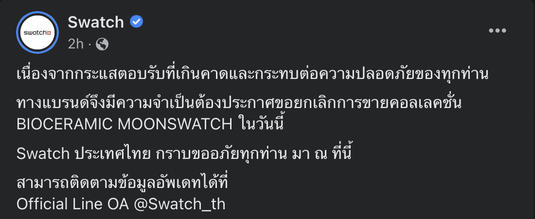 อย่างไรก็ดี ความนิยมที่มีต่อนาฬิกาที่มาจากความร่วมมือของสวอตช์และโอเมกา ก็ทำให้ท้ายที่สุด เฟซบุ๊กแฟนเพจของสวอตช์ ต้องประกาศยกเลิกการขายคอลเลกชันนี้ในที่สุด โดยขอให้ติดตามข่าวสารเพิ่มเติมที่ช่องทางไลน์ของสวอตช์ประเทศไทยต่อไป