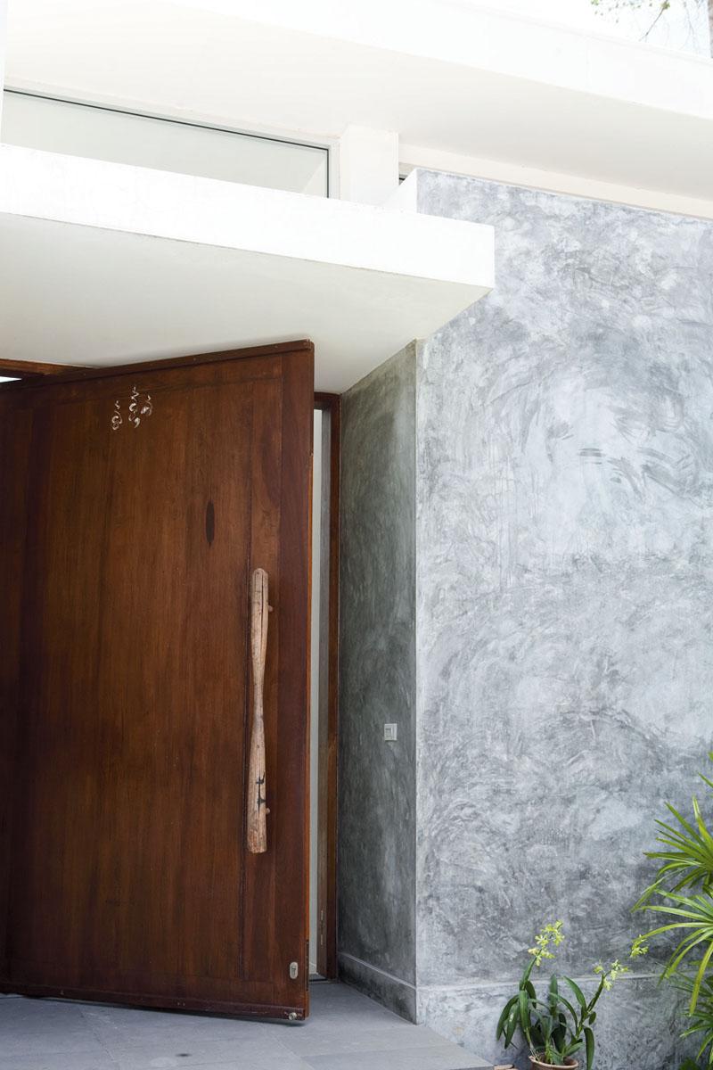 สามารถทำบานประตูหน้าบ้านให้เป็นบานไม้ทึบขนาดใหญ่ 1.20 X 2.50 เมตร ที่แข็งแรงทนแดด และความชื้นได้ด้วยการใช้ไม้จริงทั้งแผ่น ส่วนมือจับทำจากแผ่นไม้เก่าเหลาให้เป็นแท่งยาว แล้วนำมายึดกับประตูด้วยแกนเหล็ก