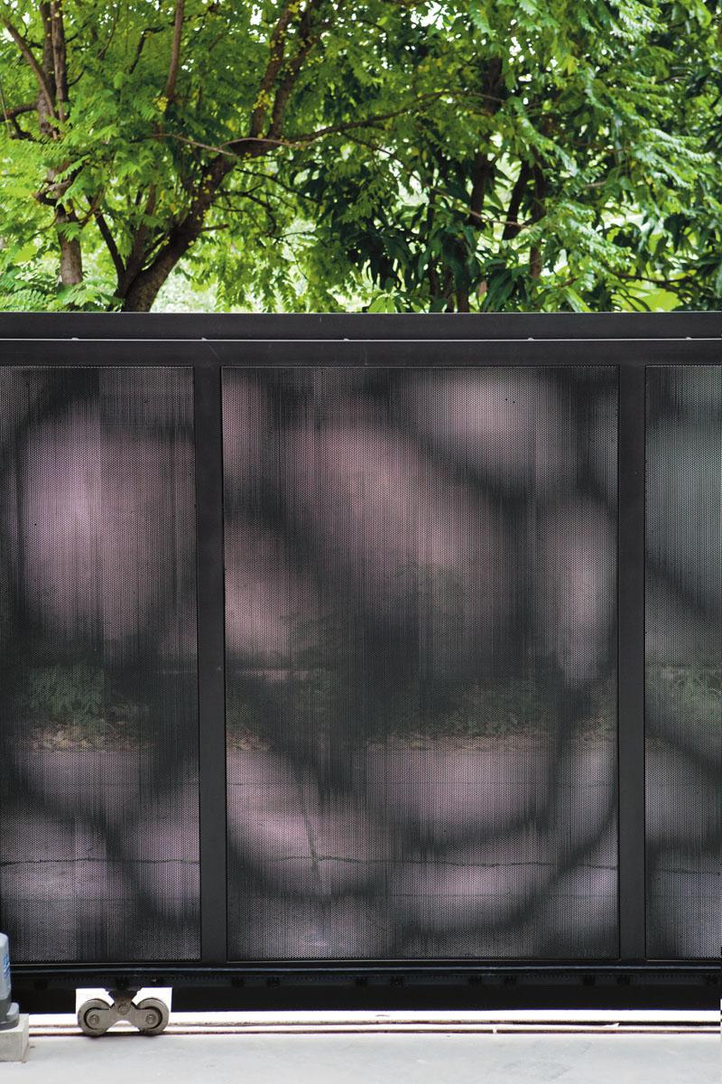 ถ้าต้องการได้บานประตูที่โปร่งแต่แข็งแรง แนะนำให้นำแผ่นเหล็กตะแกรง หรือเหล็กเจาะรูเล็กๆ ทั้งบานมาเชื่อมเข้ากับโครงสร้างกรอบบานเหล็กแล้วทาสีดำให้ดูทึบ ส่วนด้านล่างติดตั้งรางล้อเลื่อนให้สามารถเลื่อน เปิด-ปิดได้