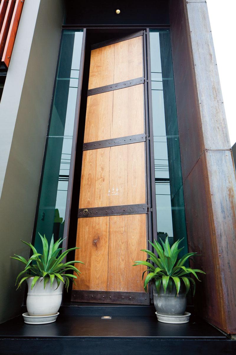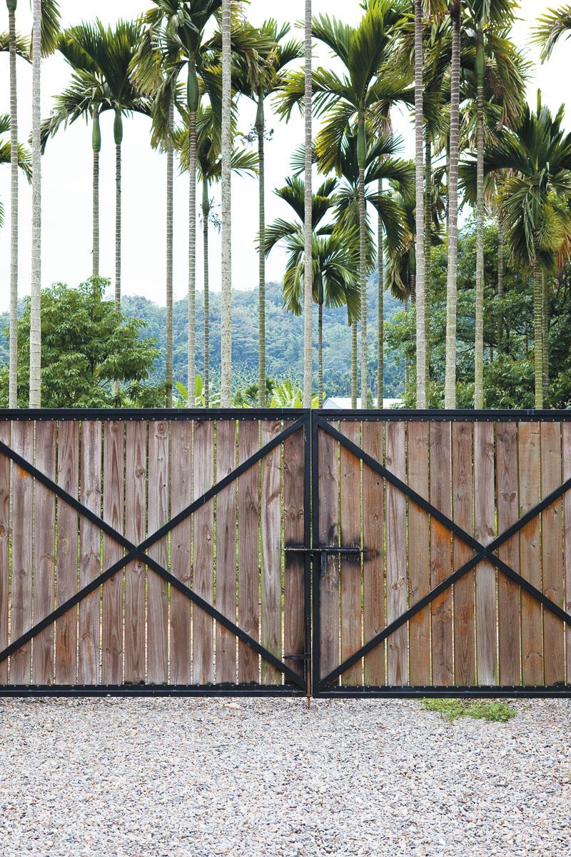 ออกแบบประตูหน้าบ้านให้เข้ากับรั้วไม้ข้างบ้าน ด้วยการนำโครงไม้ขนาด 2 X 4 นิ้ว มาเชื่อมเป็นกรอบบานเปิดแบบคู่ที่มีขนาด 1.50 X 2.00 เมตร จากนั้นเชื่อมเหล็กเหลี่ยมแบบตัน ขนาด 1 X 1 เซนติเมตร ให้เป็นตารางแบบเว้นช่อง ขนาด 30 X 60 เซนติเมตร เสร็จแล้วนำแผ่นไม้หนา 5 มิลลิเมตร ขนาด 60 X 60 เซนติเมตร มาติดลงบนโครงเหล็กให้ห่างกันแผ่นละ 15 เซนติเมตร เพื่อให้ดูโปร่งตา ทาสีให้ดูเข้ากับรั้วไม้ด้านข้าง ด้วยไอเดียนี้เรายังสามารถจัดองค์ประกอบหน้าบานประตูให้เกิดลวดลายใหม่ได้ด้วย เช่น วางแผ่นไม้ให้เป็นแนวทแยง หรือจัดเรียงแผ่นไม้บังสายตาให้มีขนาดเล็กใหญ่ต่างกันไปได้ตามต้องการ