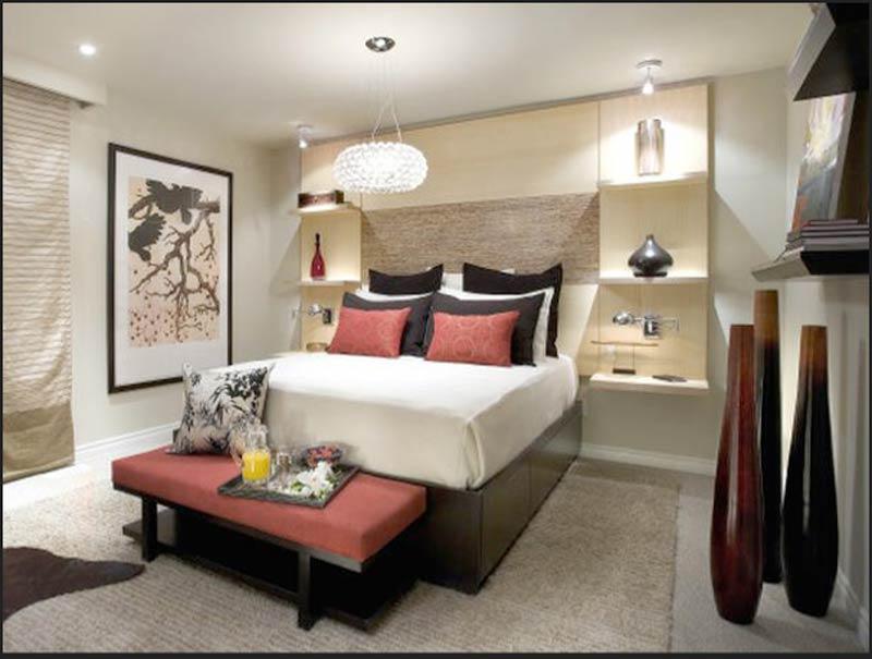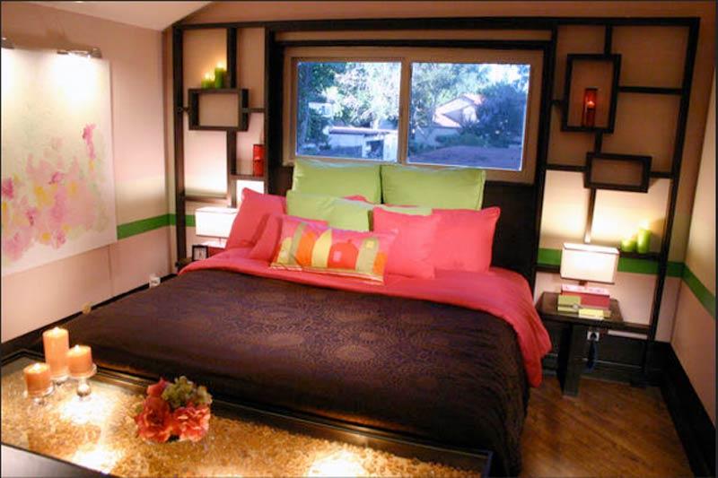 ห้องนอนสีชมพู ดูเข้ากับการเล่นสีตัดกัน โดยใช้ความเข้มของน้ำตาลมาเบรก Head Board ที่ดีไซน์เส้นสายลายเหลี่ยมแบบนี้เลยดูเข้ากัน เจาะช่องกระจกอีกเล็กน้อย เพื่อช่วยลดความอึดอัด เป็นห้องนอนที่ดูอบอุ่นในสไตล์ Asian Contemporary ได้ลงตัว