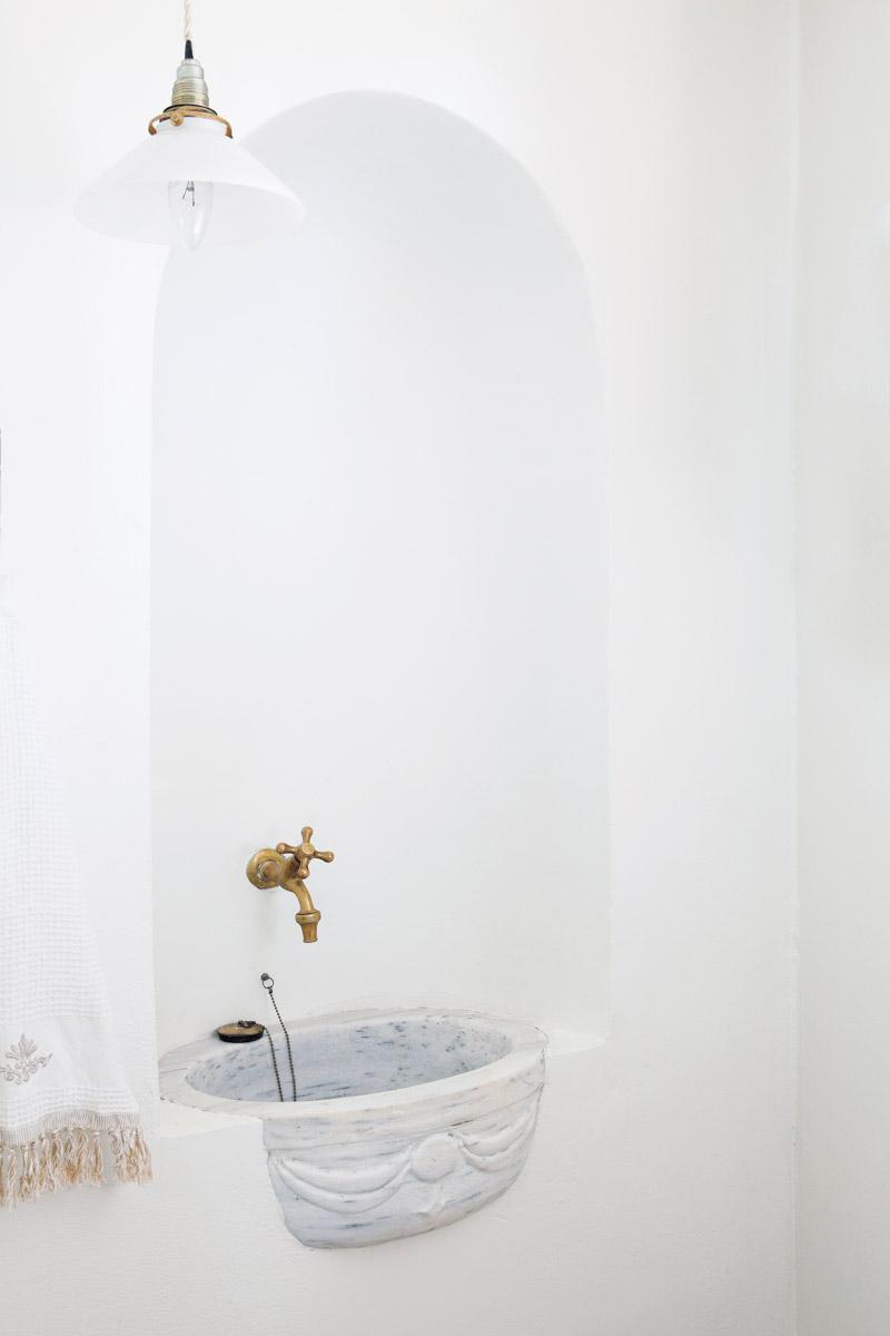 อ่างหินอ่อนวงรี ขนาด 40 X 30 X 25 เซนติเมตร แกะสลักลวดลายคลาสสิกโดยรอบ ดูสวยงามราวกับงานประติมากรรมแกะสลักชิ้นเยี่ยม นำมาติดตั้งลงในซุ้มโค้งที่ออกแบบให้ลึกเข้าไปในผนัง 30 เซนติเมตร รับกันดีกับรูปทรงของอ่างหินอ่อน เหนืออ่างล้างหน้าฝังก๊อกน้ำทองเหลืองรูปทรงคลาสสิกให้ความรู้สึกย้อนยุคเหมือนอยู่ในห้องอาบน้ำยุคโรมัน