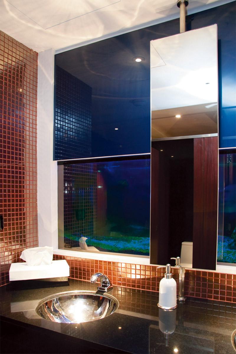 ไอเดียนี้ไม่ธรรมดาด้วยการออกแบบให้ผนังหน้าเคาน์เตอร์เป็นตู้ปลาขนาดใหญ่เต็มผนัง เปิดแสงสีฟ้าให้ความรู้สึกเหมือนอยู่ในทะเล ด้านบนตู้กรุกระจกเงาช่วยเพิ่มมิติให้ตู้ปลา ส่วนกรอบกระจกเงาส่องหน้าก็ทำจากสเตนเลสยึดเข้ากับเสาสเตนเลสที่ท็อปเคาน์เตอร์ ซึ่งสามารถปรับองศาการใช้งานได้