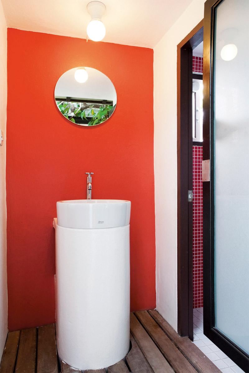 ตกแต่งอ่างล้างหน้าให้มีสีสันสดใสด้วยการกรุกระเบื้องโมเสกสีขาวสลับดำ ขนาด 2X2 เซนติเมตร รอบอ่างทองเหลือง ส่วนกระจกเงา เลือกใช้งานทองเหลืองจากอินเดีย นำมายึดกับขอบเคาน์เตอร์ด้วยแกนเหล็ก ด้านหลังทำซุ้มโค้งกรุช่องแสงกระจกสีลายดอกพิกุล สลับสีเขียวและเหลืองช่วยสร้างบรรยากาศให้ห้องดูสดใส ส่วนเคาน์เตอร์เป็นปูนผสมสีขัดมันสไตล์โมร็อกโก