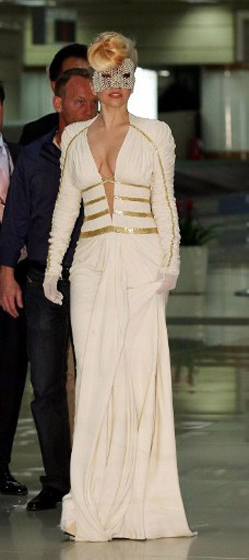 ในลุคที่ดูหรูหราตามสไตล์เลดี้ กาก้า เมื่อตอนไปที่ประเทศฮ่องกง จะให้ดูเรียบๆ หวานๆ ก็ไม่ใช่ตัวเธอ เลยจัดชุดเดรสซึ่งเต็มไปด้วยขนทั้งตัวมาใส่ ตัดกับหมวก ถุงมือสีขาว พร้อมกับแว่นตา ที่ถือเป็นเอกลักษณ์ของกาก้า