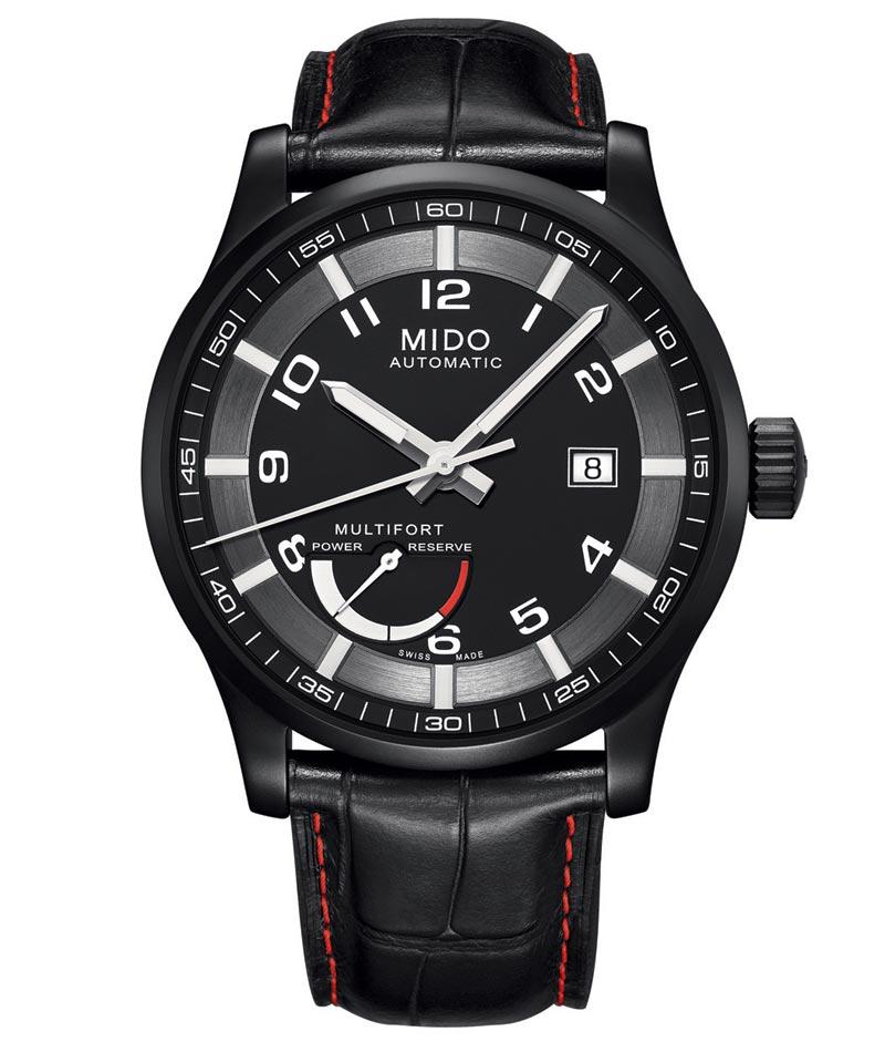 นาฬิกา “มิโด มัลติฟอร์ท เพาเวอร์ รีเซิฟ” อีกหนึ่งชิ้นงานที่สะท้อนคุณค่าความงาม และความสำเร็จอันน่าภาคภูมิใจ กับฟังก์ชั่นการใช้งานจริง พร้อมคุณสมบัติเชิงสุนทรียศาสตร์ ตัวเรือนขนาด 42 มม. ทำงานด้วยเครื่องนาฬิการะบบขึ้นลานอัตโนมัติพร้อมเข็มบอกกำลังลานสำรอง 42 ชั่วโมง จนถึงจุดที่ลานหมดและนาฬิกาหยุดเดิน ความแข็งแกร่งคงทนและน่าเชื่อถือของนาฬิการุ่นนี้จะทำให้ Multifort Power Reserve เป็นนาฬิกาที่ควรคู่กับสุภาพบุรุษทุกท่านที่หลงใหลในศาสตร์อันละเอียดอ่อนแห่งการประดิษฐ์นาฬิกา ฝาหลังใสให้ดื่มด่ำในความงามของการขัดแต่งลวดลายต่างๆ บนตัวเครื่อง รุ่นนี้มาในมาดสปอร์ตเต็มขั้นด้วยสีดำล้วน บนหน้าปัดมีวงแหวนขัดลายซาติน หลักชั่วโมงทั้งหมดและเข็มนาฬิกาเคลือบด้วย Super-LumiNova® สีขาวเพื่อความสะดวกในการอ่านค่าแม้ในเวลากลางคืน กันน้ำถึงระดับ 10 บาร์ (100 เมตร / 330 ฟุต) ด้วยเม็ดมะยมแบบขันเกลียว และเก๋ไก๋ด้วยสายหนังสีดำเดินด้ายสีแดง.