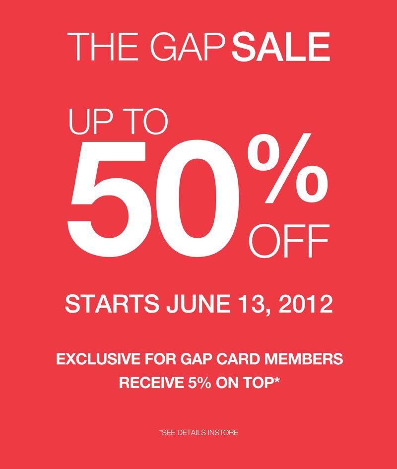 ในเทศกาล The Gap Sale ด้วยส่วนลดสูงสุด 50% ตั้งแต่วันที่ 13 มิถุนายน 2555 ที่ Gap ทั้ง 7 สาขา ได้แก่ เซ็นทรัลเวิลด์ สยามพารากอน พาราไดซ์ พาร์ค เซ็นทรัลลาดพร้าว เซ็นทรัล พระราม 9 รอยัล การ์เด้นท์ พลาซ่า พัทยา และสาขาล่าสุด เมกาบางนา พิเศษสุดสำหรับสมาชิกบัตร “เดอะ แก๊ป การ์ด” รับส่วนลดเพิ่ม อยากรู้ว่าจะเป็นอะไร เจอกันได้ที่ Shop ละกัน