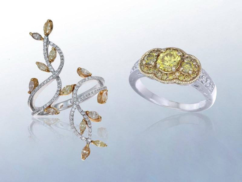 เครื่องประดับชิ้นเด็ดที่เลดี้สาวแสนหวานไม่ควรพลาดใน “บลูม คอลเลกชั่น” (Bloom Collection) กับแหวนเพชรดีไซน์กิ่งไม้อ่อนช้อย ที่เลือกเพชรแฟนซีสีเหลืองทรงมาร์คีส์ขึ้นตัวเรือนเป็นรูปทรงใบไม้ เข้าคู่ลงตัวกับเพชรทรงกลมน้ำงามที่วางเรียงร้อยเป็นกิ่งก้านแลดูพลิ้วไหว ในขณะที่ด้านสาวเท่ ไม่ควรพลาดเช่นกันกับแหวนเพชรทรงกลมดีไซน์หลากหลายสไตล์ ที่มีทั้งตัวเรือนแบบหนาและแบบบาง แต่เน้นลวดลายเส้นสายที่มีทั้งเส้นโค้ง เส้นหยัก สวมใส่เข้าเซตกับต่างหูเพชรห้อยทรงกลม ซึ่งชิ้นเด่นต้องยกนิ้วให้กับแหวนเพชรเหลี่ยมรอบวง และแหวนเพชรแฟนซีสีเหลือง 3 เม็ด (Trilogy)