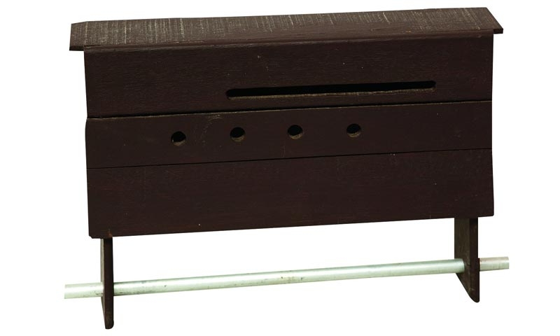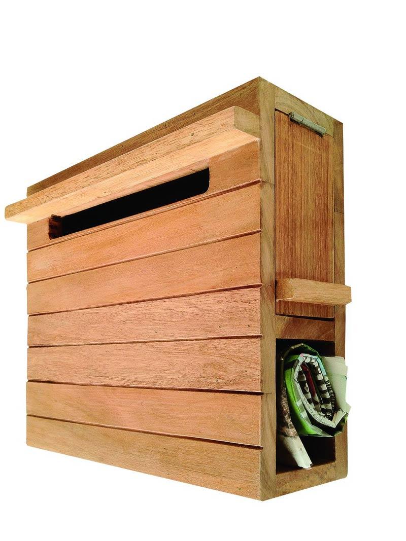 ตู้รับจดหมายไม้ตะแบก ด้านล่างมีช่องใส่ม้วนหนังสือพิมพ์ ด้านบนเป็นช่องใส่ซองจดหมาย และวางเอกสารต่างๆ