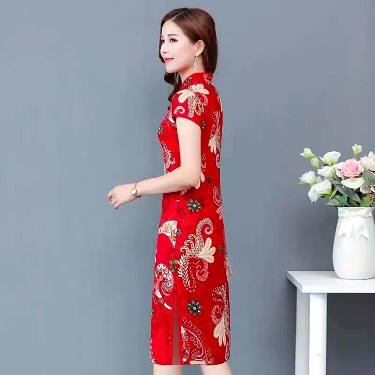 ชุดกี่เพ้าประยุกต์แขนสามส่วน จากร้านเสื้อผ้า เดรส กางเกงหญิง เป็นเดรสยาว ใช้ผ้าโพลีเอสเตอร์ ไม่หนา สวมใส่สบาย ดีเทลพิมพ์ลายดอกไม้และลายมังกรสีทอง ผ้าหน้า ใส่ออกงานทางการได้ มี 9 ไซส์ ให้เลือก ตั้งแต่ S-6XL ราคา 178 บาท ดูรายละเอียดสินค้าได้ที่ Shopee