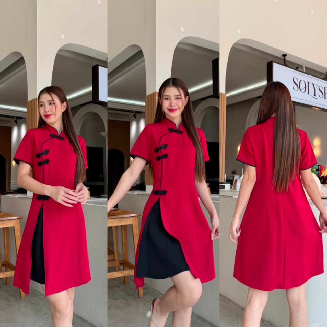 ชุดกี่เพ้าประยุกต์ จากร้าน Avalyn cotton เป็นชุดเดรสสีแดง คอจีน แขนสั้น ติดกระดุมเฉียง ผ้าฮานาโกะ ไม่รัดรูป อกฟรีไซส์ 32-36 นิ้ว ความยาว 35 เซนติเมตร ราคา 220 บาท ดูรายละเอียดสินค้าได้ที่ Shopee