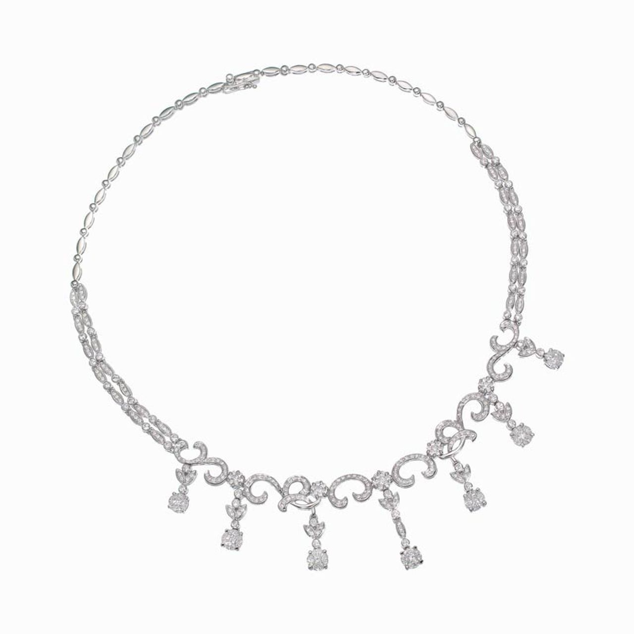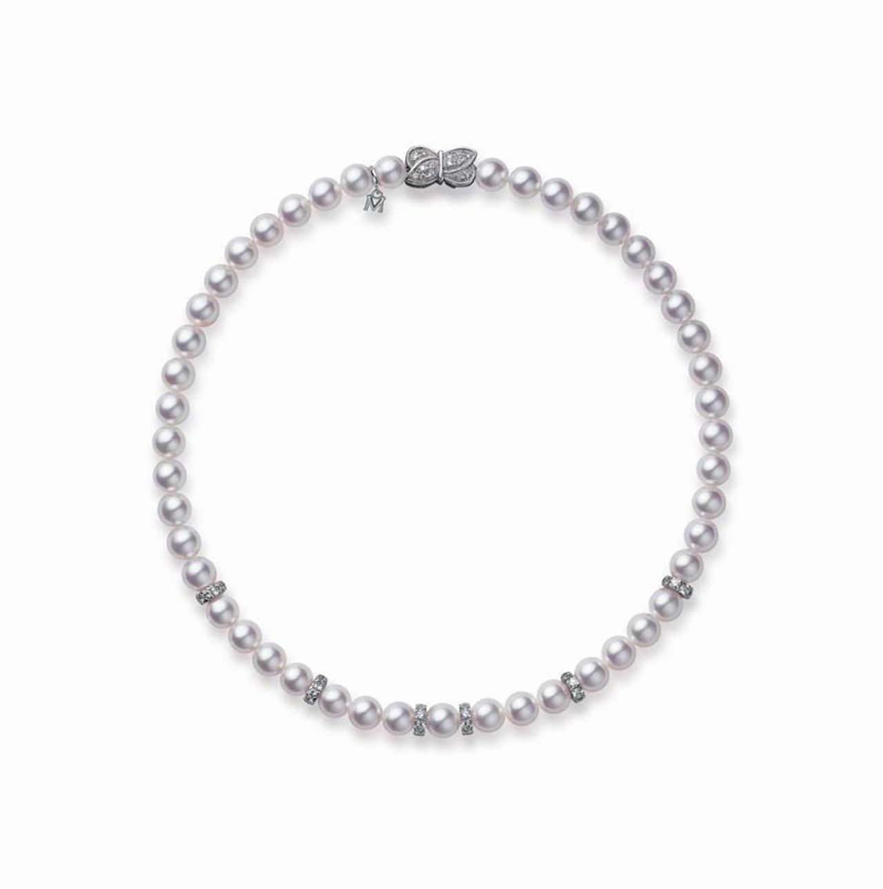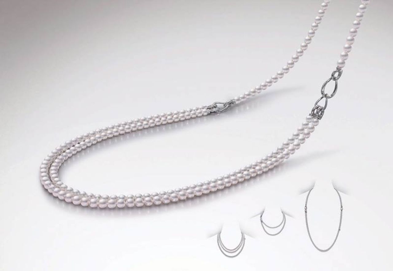 Mikimoto Princess Akoya Pearl Necklace โดดเด่นด้วยไข่มุกอะโกย่าสีขาวบริสุทธิ์ ขนาด 7.5 ถึง 8.0 มิลลิเมตร นำมาเรียงร้อยไล่ขนาดกันเป็นสร้อยมุกความยาว 18 นิ้ว และเพิ่มความหรูหราด้วยบ่าเพชรคั่นระหว่างมุก จำนวน 6 บ่า น้ำหนักเพชรรวม 1.734 กะรัต ส่วนตะขอประดับเพชรบนตัวเรือนทองคำขาว 18 เค คลาสสิกเหนือกาลเวลา
