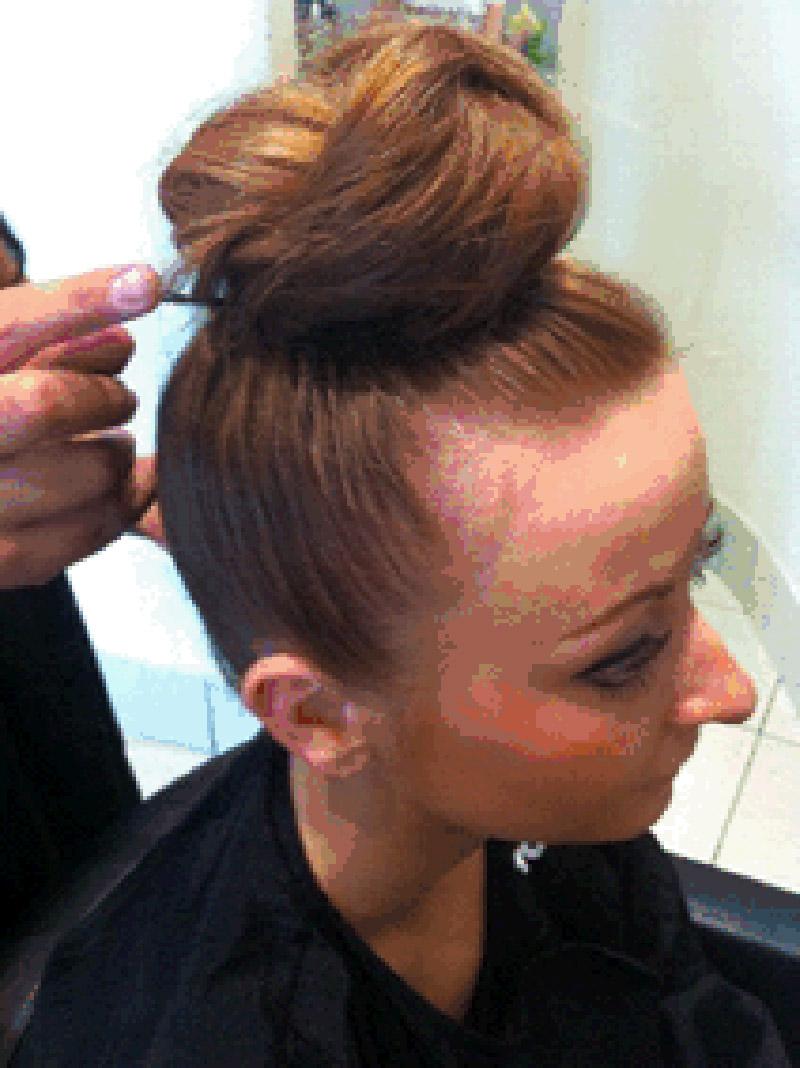 2. ยีหางม้าให้ผมมีวอลลุ่ม แบ่งหางม้าออกเป็น 2 ส่วน ขมวดหางม้าทั้งสองส่วนให้เป็นเกลียว แล้วขดปลายผมเป็นมวย ซ่อนปลายและติดกิ๊บเพื่อให้ผมอยู่ทรง