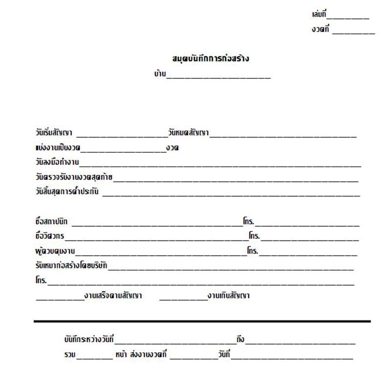 แบบฟอร์มนี้สำหรับเป็นหน้าแรกของสมุดบันทึก โดยสร้างสมุดบันทึก 1 เล่มต่อ 1 งวดการก่อสร้าง เพื่อความสะดวกในการตรวจสอบย้อนหลัง หน้าแรกของสมุดบันทึกควรมีรายละเอียดสำคัญหลักๆ เพื่อให้เราใช้อ้างอิงได้โดยไม่ต้องรื้อค้นสัญญามาดูให้เสียเวลา