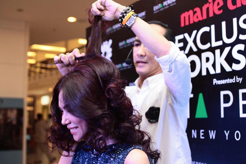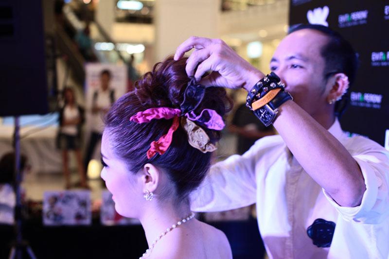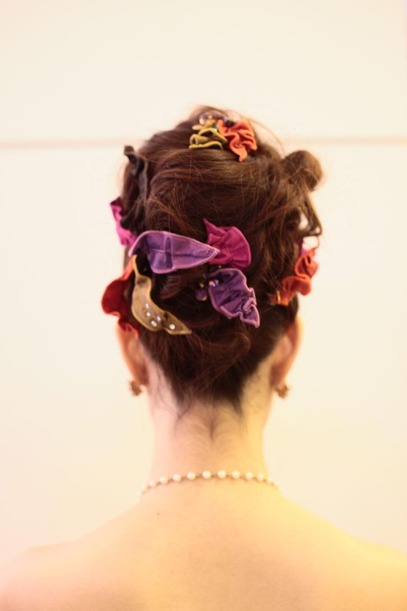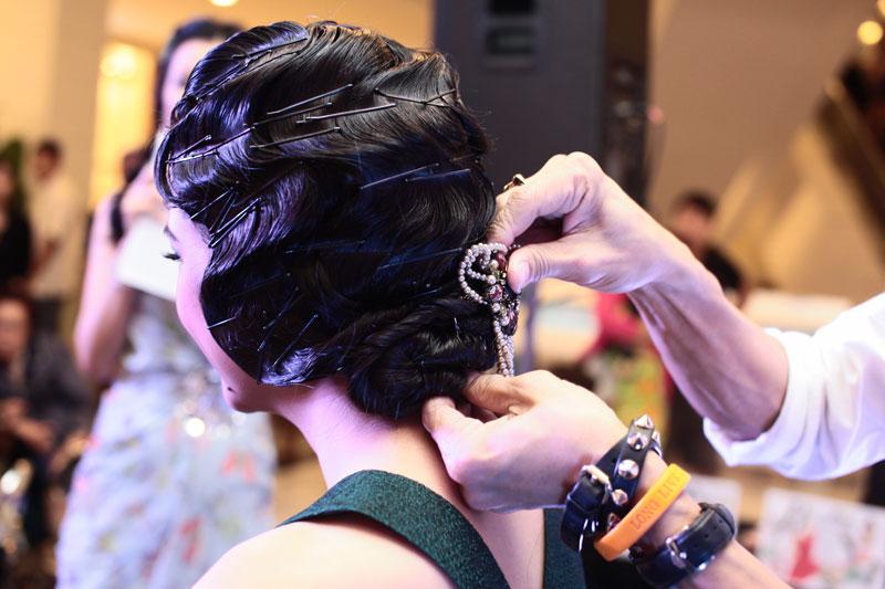 ลุคที่ 2 “Pret-a-Party” สำหรับสาวหวาน โดยขั้นตอนแรกของการเตรียมผมคือการจับผมให้เป็นพุ่มสูงอยู่กลางศีรษะ ประดับผมด้วยกิ๊บติดผม และปิ่นปักผมรูปกลีบดอกไม้ทำจากผ้า taffeta เนื้อมันวาวในโทนสีสดใส ประดับด้วยคริสตัลเพิ่มความแวววาว