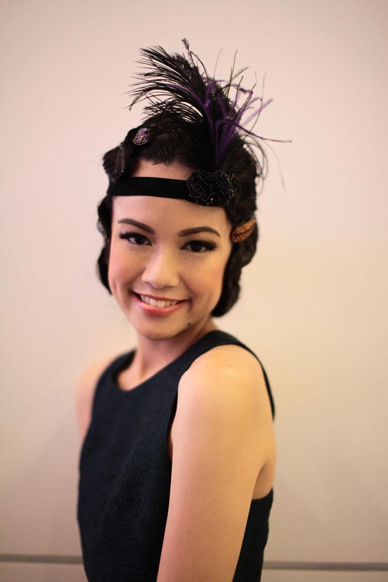 ลุคที่ 1 “Gatsby” สไตล์ย้อนยุค โดยทำผมเป็นลอนเปียกทั้งศีรษะ ประดับผมด้านหลังด้วยหวีสับประดับลูกปัดแก้ว และมุกในสไตล์วิทเทจ คาดที่คาดผมกำมะหยี่ประดับขนนกและลูกปัดด้านหน้า เติมความสมบูรณ์ขั้นสุดท้ายด้วยกิ๊บตัวเล็กประดับลูกปัดในโทนสีเดียวกัน