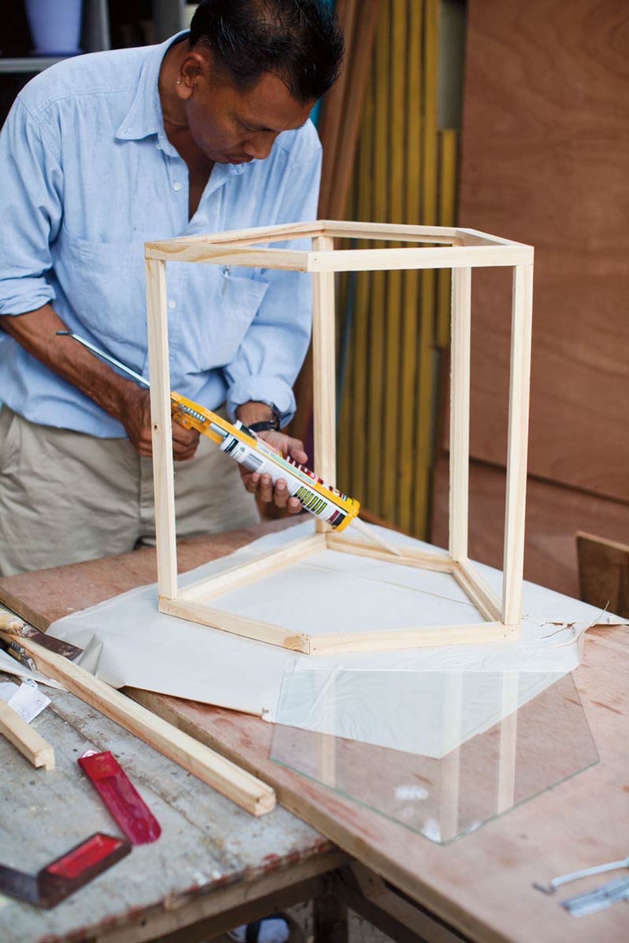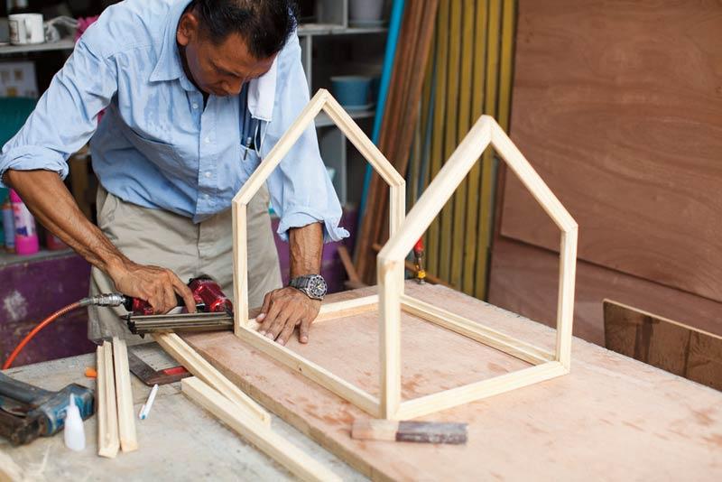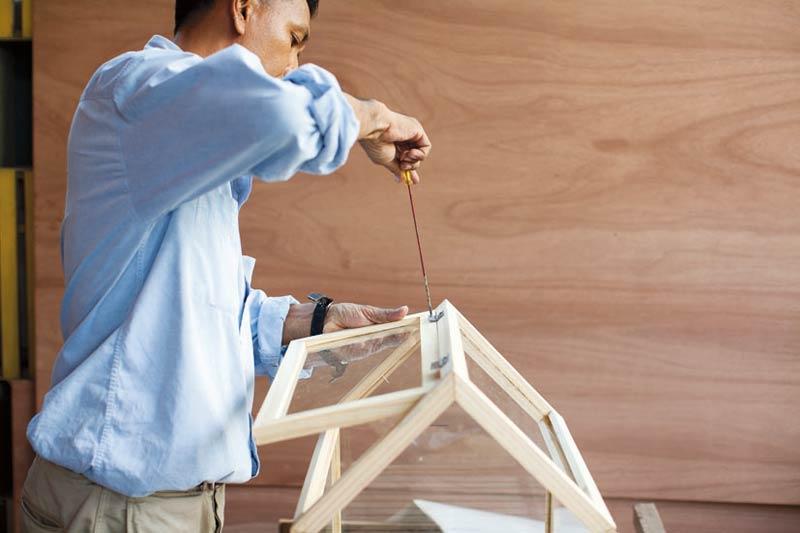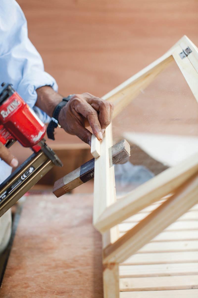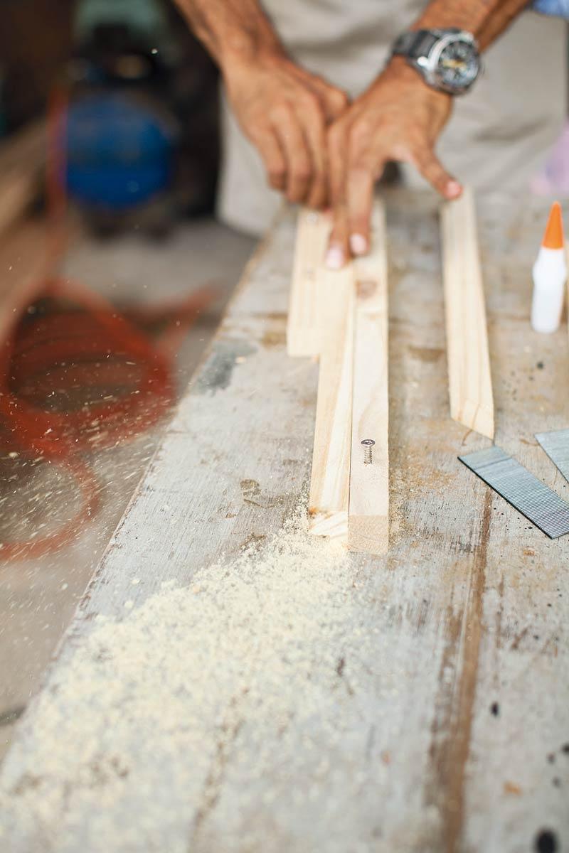 ประกอบไม้เข้าด้วยกัน โดยเริ่มประกอบบานหน้าจั่วก่อน