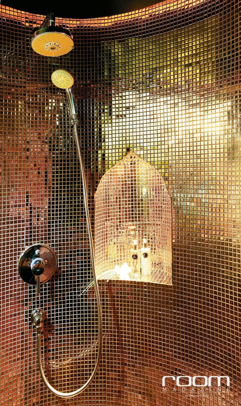 การใช้กระเบื้องโมเสกคงไม่ใช่วิธีแปลกใหม่นัก แต่ถ้าเราเลือกสีหรือนำลูกเล่นของวัสดุนั้น ๆ มาใช้ก็จะทำให้มุมนั้น ๆ ดูสวยและเพิ่มความหรูหราขึ้นได้ เช่น ไอเดียการกรุผนังห้องน้ำขนาด 2 x 3 เมตร ด้วยกระเบื้องโมเสกสีทองสุดหรู และออกแบบผนังในส่วนอาบน้ำให้มีลักษณะโค้ง แล้วเจาะช่องผนังเป็นรูปทรงโดมแบบอาหรับ ใช้วางขวดแชมพูและครีมอาบน้ำ ใส่ความพิเศษอีกนิดด้วยการซ่อนไฟดาวน์ไลท์ใต้ผนังเล่นกับสีทองของกระเบื้องโมเสกให้เปล่งประกายระยิบระยับ สร้างบรรยากาศระหว่างการอาบน้ำให้มีกลิ่นอายแบบตะวันออกกลางสุดเซ็กซี่