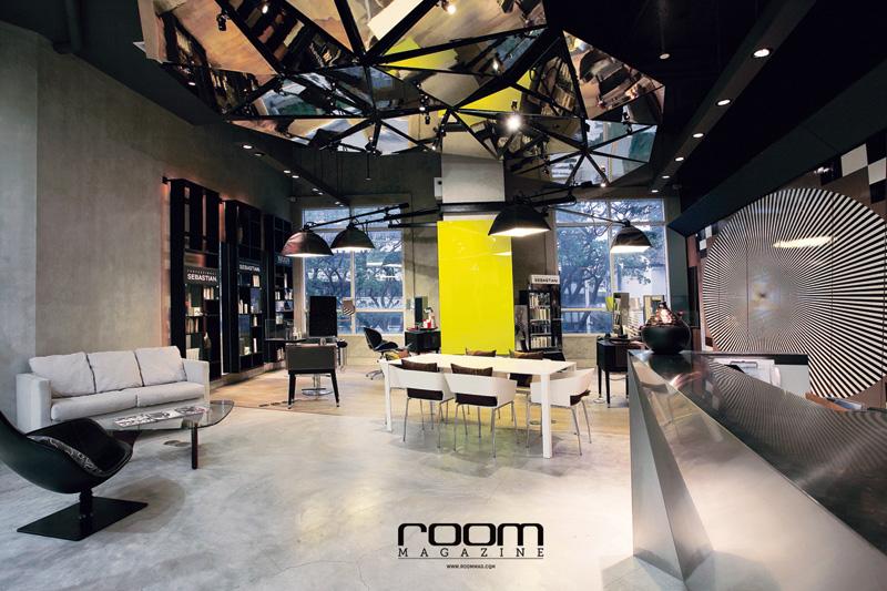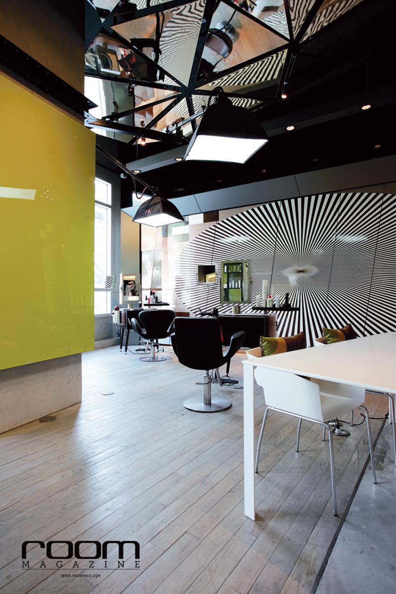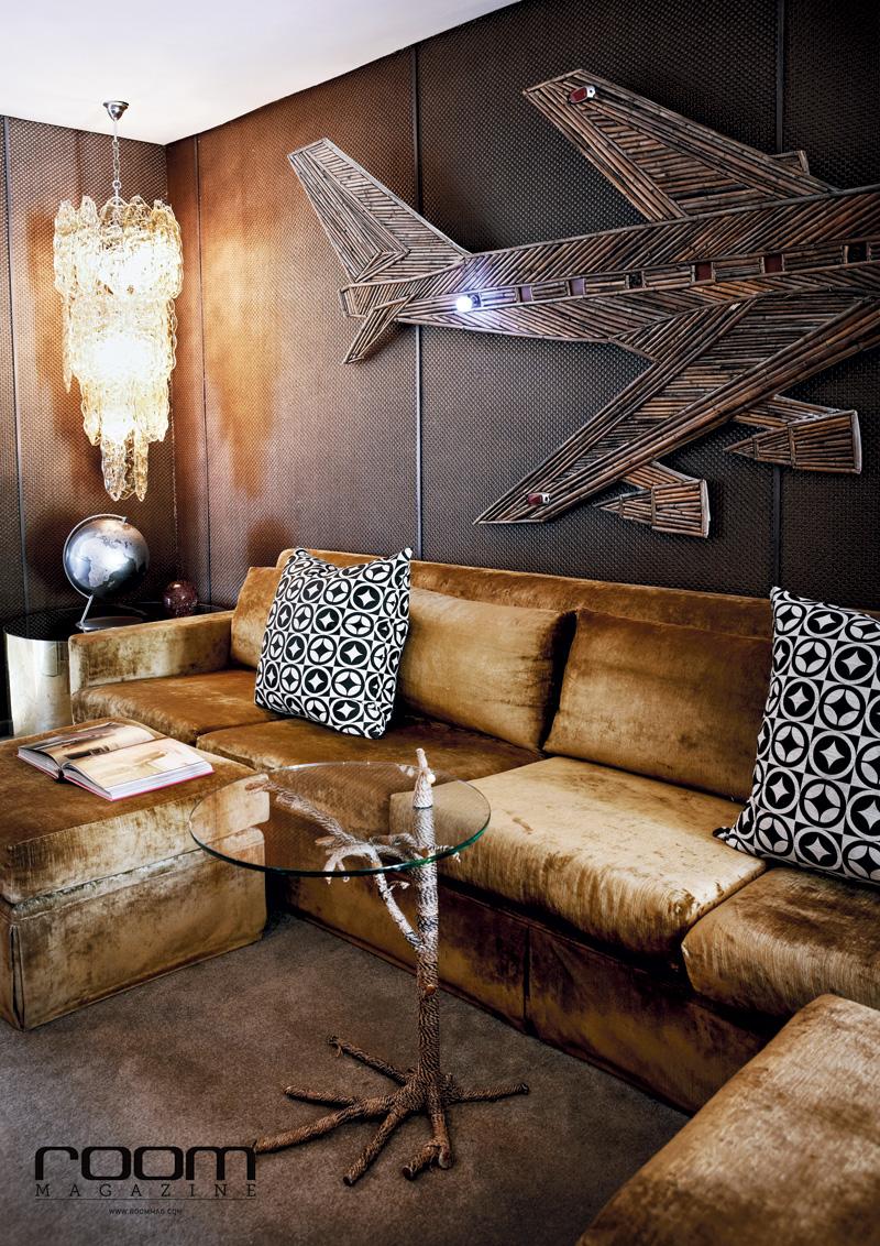 บางครั้งการเพิ่มลูกเล่นเฉพาะส่วนใดส่วนหนึ่งของห้องก็สามารถช่วยให้ดูน่าสนใจขึ้นได้ อย่างการเลือกใช้แผ่นลามิเนตสีทองก็เป็นไอเดียง่าย ๆ ที่ทำให้ห้องดูแปลกตาและหลอกตาด้วยเท็กซ์เจอร์ แผ่นลามิเนตสีทองทรงสามเหลี่ยมในไอเดียนี้มีลักษณะเหมือนกระจกเงาแต่มีน้ำหนักเบากว่า โดยนำมาวางเรียงกันไปมาแบบเว้นร่องประมาณ 5 เซนติเมตร จนเต็มเพดานเหมือนเป็นอัญมณีระยิบระยับ พื้นหลังเพดานทาสีดำ ขับให้แผ่นลามิเนตดูมีมิติโดดเด่นจนใครต่อใครต้องเหลียวมอง พื้นปูไม้สีเบจให้เข้ากันได้กับวัสดุหลากหลาย ผนังเป็นแผ่นกระจกสีเขียวเล่นลวดลายขาว-ดำดูหรูหราแบบสนุกสนานสะท้อนไปมากับเพดานลามิเนตสีทอง