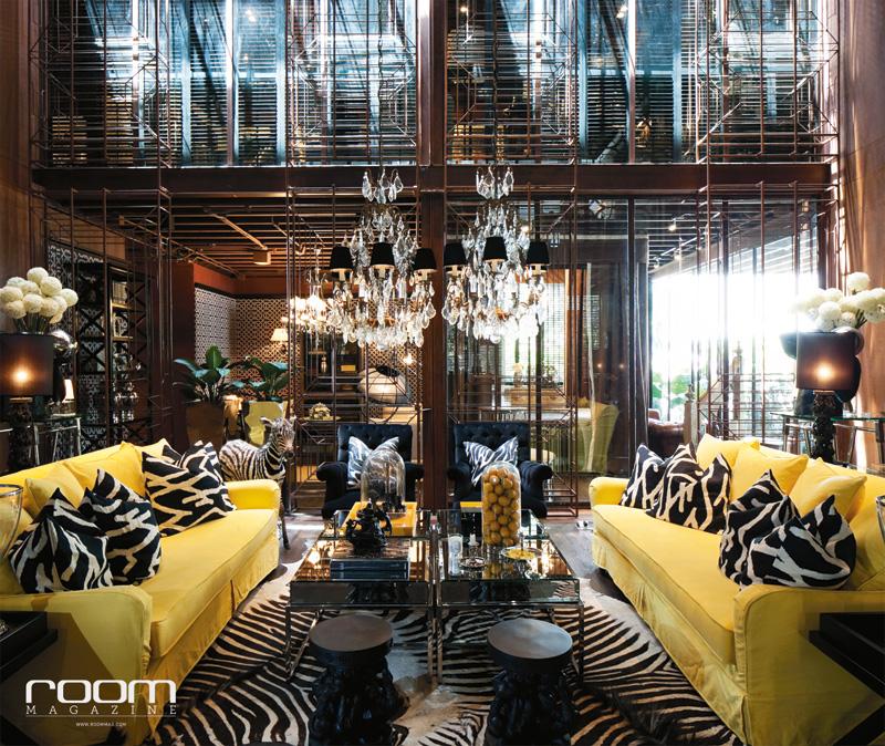 เฟอร์นิเจอร์สีสดใสสไตล์โมเดิร์นสามารถเพิ่มความหรูหราได้ด้วยองค์ประกอบอื่น ๆ อย่าง หมอนอิง พรม และโคมไฟ กับไอเดียการจัดมุมรับแขกขนาด 6 x 6 เมตร ด้วยการจัดวางโซฟาสีเหลืองสดสะดุดตา 2 ตัว ให้หันหน้าเข้าหากัน ซึ่งถือเป็นพระเอกของมุมนี้ก็ว่าได้ แล้วเติมอาร์มแชร์หนังสีดำและสตูลเข้าไปอีกหน่อยให้นั่งคุยกันได้สะดวก จากนั้นหาโต๊ะกลางกระจกใสดีไซน์หรูหราขาสแตนเลสใช้วางของตกแต่งอย่างโถผลไม้ และแขวนแชนเดอเลียร์คริสตัส 2 ตัวคู่กัน เพื่อสร้างบรรยากาศสุดหรูให้ห้อง สุดท้ายเพิ่มลูกเล่นจากลวดลายของหมอนอิงและพรมหนังม้าลายให้ความเป็นโมเดิร์นและคลาสสิกตัดกับโซฟาสีเหลืองสดใสได้อย่างลงตัว