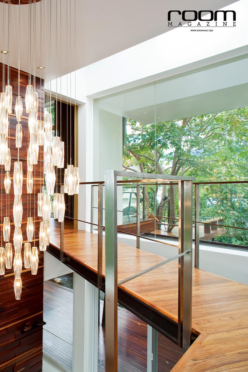 ส่วนใหญ่แล้วมุมโถงบันไดเป็นมุมที่มักจะอยู่กึ่งกลางของบ้านอยู่แล้ว เรามาหาไอเดียทำมุมนี้ให้มีสไตล์แบบเรียบหรูกันดีกว่า ด้วยการทำทางเดินแบบ Single Corridor พาดอยู่กลางโถงบันไดขนาด 6 x 6 เมตร กึ่งดับเบิ้ลสเปซ และใช้ราวกันตกสแตนเลสแบบเรียบ ๆ ช่วยให้พื้นไม้ดูโมเดิร์นและหรูหรา เพิ่มลูกเล่นด้วยการติดไฟแขวนเพดานไว้ด้านข้าง มีการเปิดช่องแสงจากสกายไลท์ลงมาที่ทางเดินก่อนถึงทางลงบันไดพอดี นอกจากช่วยเพิ่มแสงสว่างแล้ว ยังเป็นการเปิดรับบรรยากาศสีเขียวจากสวนผ่านช่องเปิดกระจกใสบานใหญ่ โถงบันไดนี้จึงเป็นอีกมุมหนึ่งของบ้านที่มีบรรยากาศดีสุด ๆ