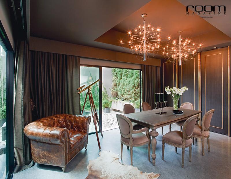 สำหรับคนที่ชอบความหรูหราแบบเรียบ ๆ และดูเป็นผู้ใหญ่ เรามีไอเดียการรวมวัสดุที่ต่างกันให้สามารถเข้ากันได้ ระหว่างผนังไม้กับความแวววับของสแตนเลส เพื่อเพิ่มความหรูหราในห้องรับประทานอาหารขนาด 4 x 4 เมตร คุมโทนด้วยสีน้ำตาลหลายเฉดสีทั้งเข้มและอ่อน ซึ่งมาจากเฟอร์นิเจอร์หนัง ผนังไม้ ผ้าม่านที่ใช้เปิดชมวิวจากสวนนอกบ้าน และของตกแต่งต่าง ๆ เพิ่มลูกเล่นให้ผนังด้วยการทำประตูบานเฟี้ยมแบบ 4 บาน ขนาดบานละ 1 เมตร ไว้เปิดเชื่อมพื้นที่กับส่วนอื่นของบ้าน ติดขอบประตูและหน้าบานแต่ละบานด้วยคิ้วสแตนเลสเป็นกรอบสี่เหลี่ยม ช่วยให้มุมรับประทานอาหารมุมนี้เรียบหรูอบอุ่นในสไตล์คลาสสิกอย่างสมบูรณ์แบบ