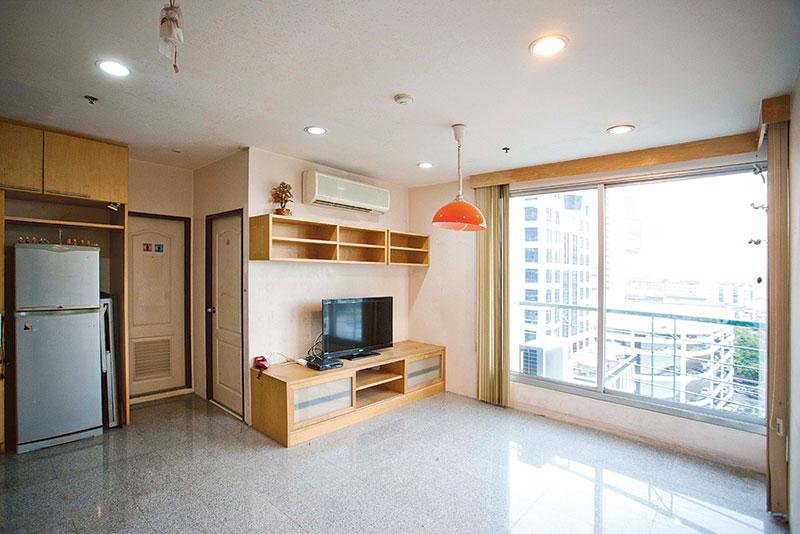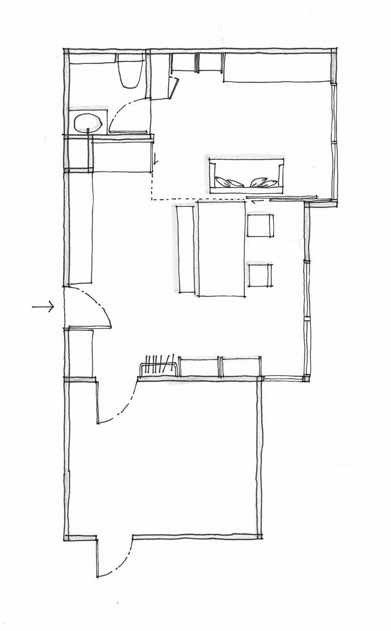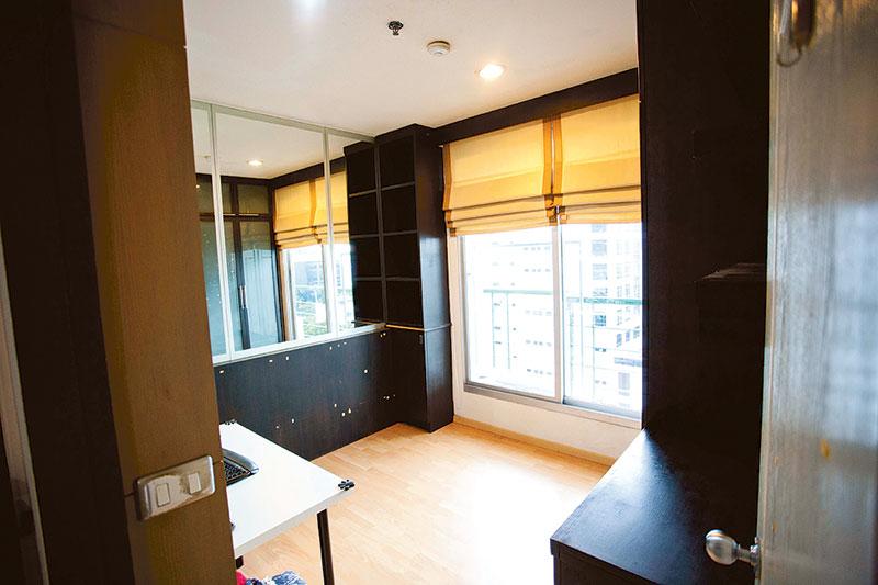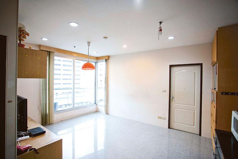 ผนังห้องนอนเล็กถูกทุบทิ้ง เพื่อขยายห้องให้ดูกว้างขึ้น และร่นระยะห้องน้ำลง โดยการตัดส่วนที่เป็นอ่างอาบน้ำออกไป ทำให้ได้พื้นที่มุมนั่งเล่นดูทีวีเพิ่มขึ้น การกั้นพื้นที่ด้วยกระจกใส ทำให้ห้องไม่ดูอึดอัด เมื่อมีลูกค้ามาลองเสื้อผ้า จึงสามารถเลื่อนปิดกระจก ให้ความรู้สึกเป็นสัดส่วน และสามารถใช้พื้นที่ทั้งสองส่วนได้พร้อมกัน โดยไม่รบกวนกัน