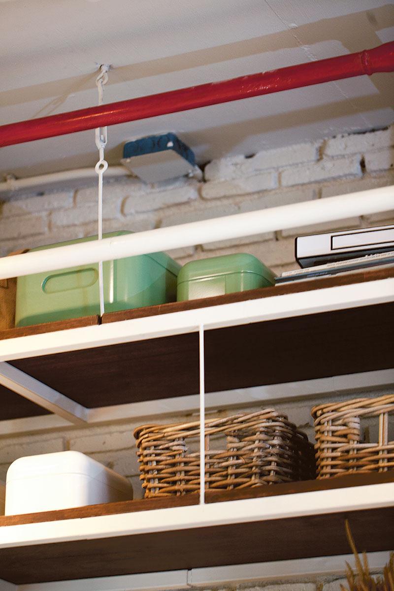 ชั้นเก็บของแบบ open shelf ที่ทำล้อมกรอบในส่วนบนสุดของผนัง เพิ่มความสะดวกในการใช้งานด้วยบันไดติดล้อเลื่อน สามารถเลื่อนไปในตำแหน่งที่ต้องการได้อย่างง่ายดาย เพิ่มเหล็กเส้นแนวตั้งยึดระหว่างชั้น เพื่อความแข็งแรงของชั้นเก็บของด้านบน โต๊ะตัวใหญ่ท็อปไม้หิ้งขาโครงเหล็กทำสีสนิม รุ่น Pipe line เข้ากับห้องได้เป็นอย่างดี