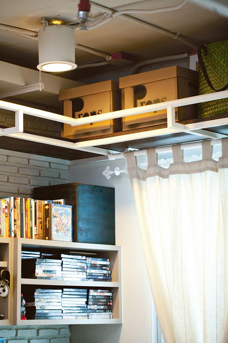 ติดราวแขวนผ้าม่านแบบกลับหัว โดยยึดจากโครงเหล็กด้านบนแทน เพื่อเพิ่มพื้นที่ชั้นเก็บของให้มากที่สุด