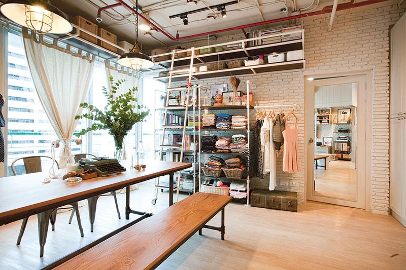 เมื่อเปิดประตูเข้ามา จะเจอกับโต๊ะทำงานแบบที่เรียกว่า Universal Table เป็นทั้งโต๊ะทำงาน โต๊ะเย็บผ้า โต๊ะกินข้าว และในอนาคตจะเป็นโต๊ะทำขนมอีกด้วย ผนังก่ออิฐโชว์แนวทาสีขาว ให้ความรู้สึกดิบๆ เข้ากับชั้นวางของที่ทำจากท่อเหล็กสีขาว ฝ้าเพดานห้องถูกเปิดขึ้นไป เพื่อเพิ่มเนื้อที่ในการเก็บของแนวตั้ง