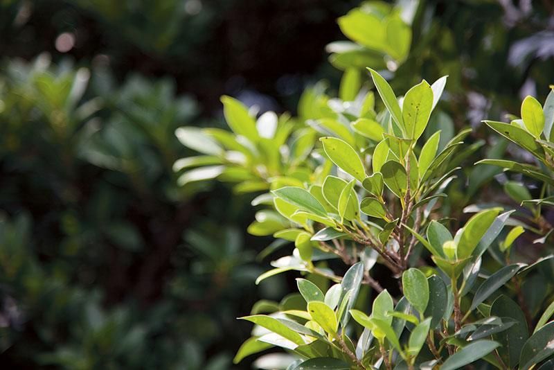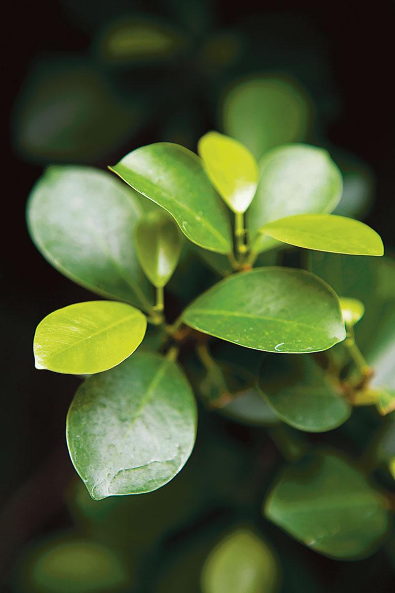 ไม้พุ่ม ใบมีสีเขียวเข้ม ลักษณะใบค่อนข้างกลม ขอบใบเรียบ ผิวใบมัน เรียงซ้อนกันเป็นพุ่มหนา นิยมนํามาตัดแต่งหรือทําเป็นผนังรั้วกําแพงบ้าน อยู่ในพื้นที่แสงครึ่งวันหรือร่มรําไรได้