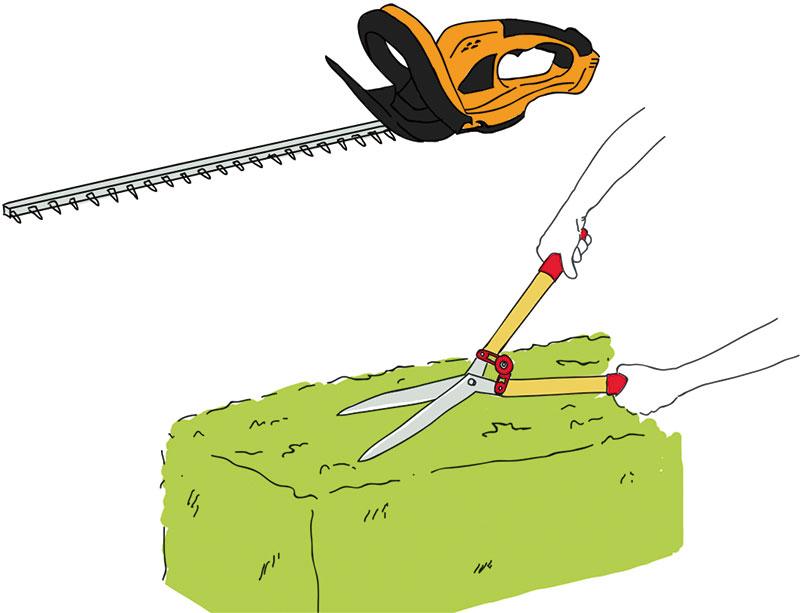 เทคนิคง่ายๆ คือ ปักหลักไม้ไว้ที่หัวกับท้าย ขึงเชือกตึงจนได้ระดับตามที่ต้องการ เพื่อให้ได้รูปทรงสี่เหลี่ยมพอดี ควรขึงเชือกทั้งในแนวตั้งและแนวนอน แล้วเริ่มตัดจากยอดด้านบนก่อน ตัดด้านข้างทีหลัง.
