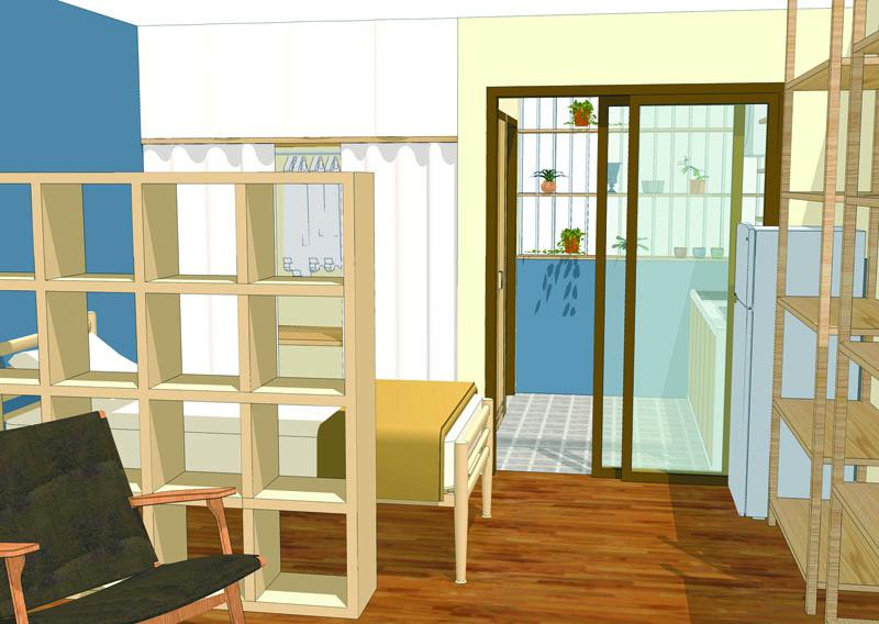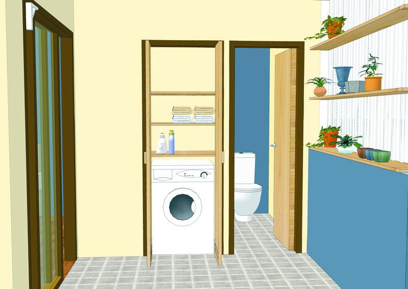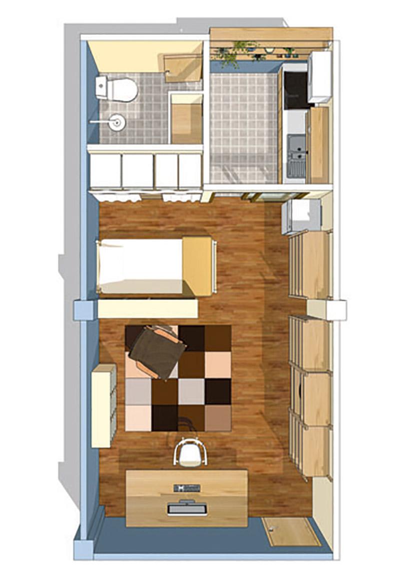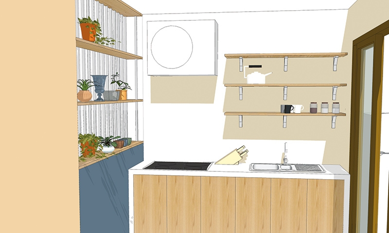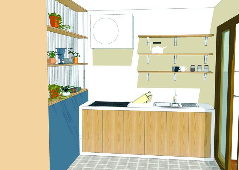 ขยายครัวด้วยการขยับตําแหน่งประตูเข้ามาด้านในห้องอีก 60 เซนติเมตร เพื่อให้สามารถทํา เคาน์เตอร์ครัวได้กว้างมากขึ้น ย้ายตําแหน่งประตูห้องน้ําเสียใหม่ เพื่อจะได้ใช้ประโยชน์ของผนังห้องน้ํา เป็นตําแหน่งวางเครื่องซักผ้าแทน ส่วนด้านในห้องต้องแต่งเติมเป็นตู้เสื้อผ้าและชั้นเก็บของ ได้ประโยชน์เต็มพื้นที่ และติดม่านปิดให้เป็นระเบียบเรียบร้อย