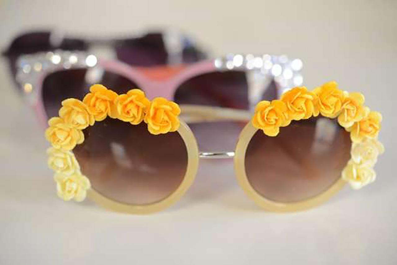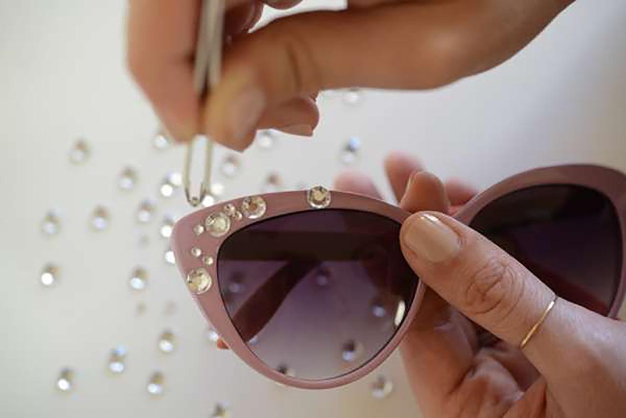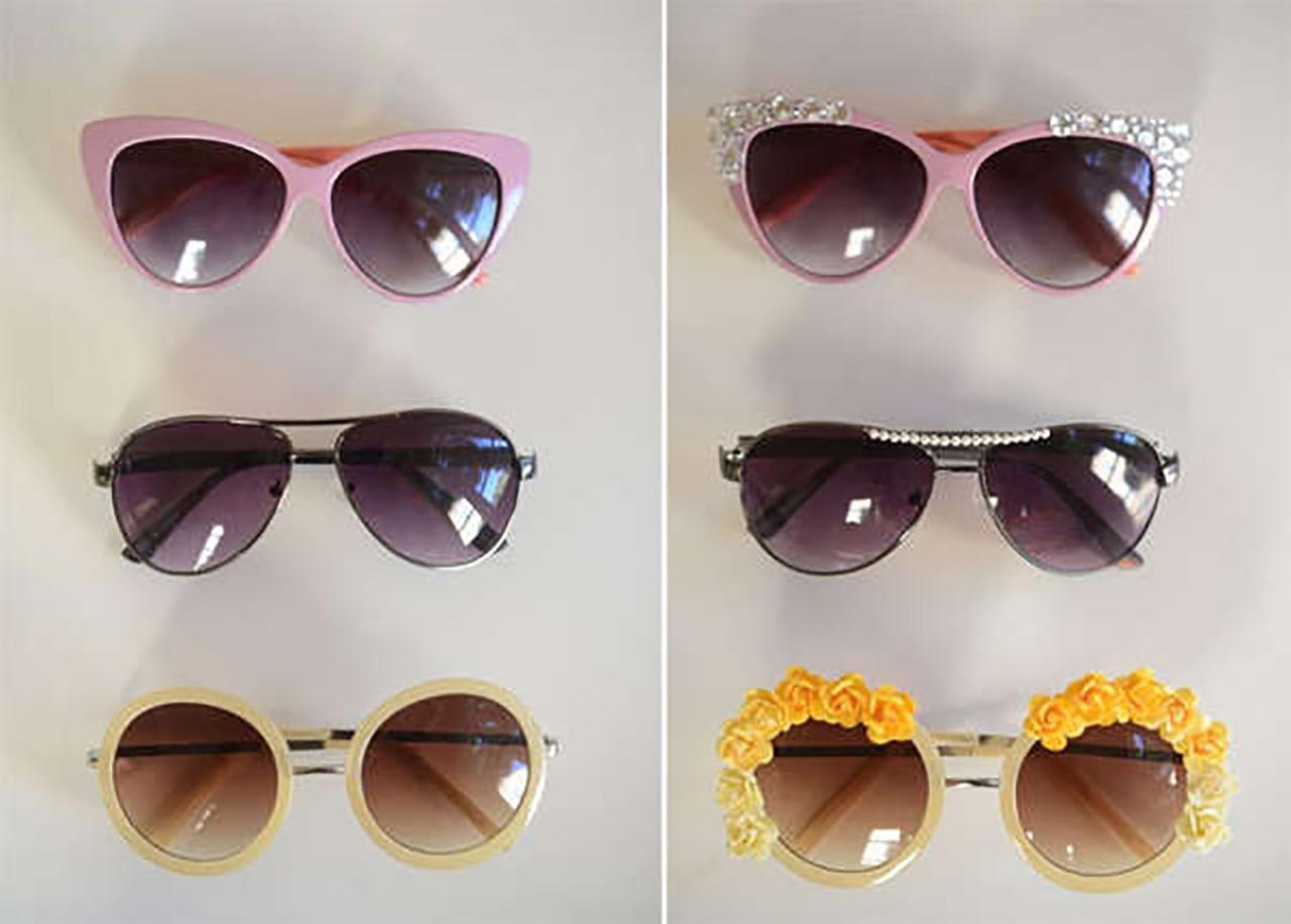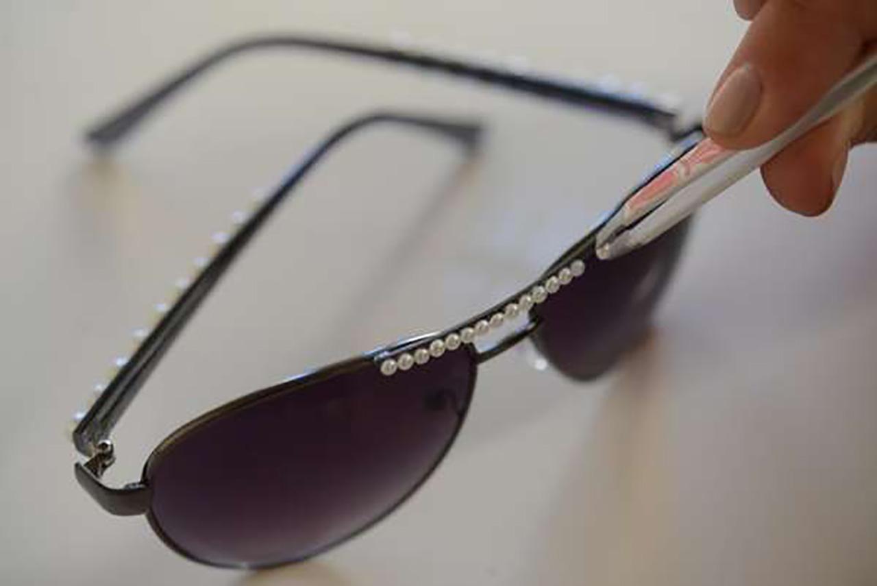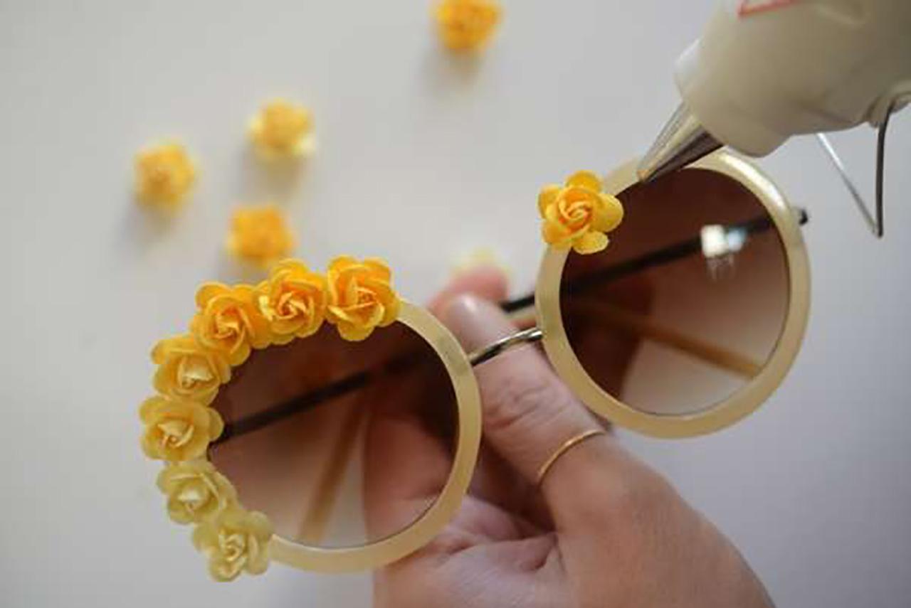 เริ่มต้นจากการทำความสะอาดแว่นเก่าของเราก่อน หลังจากนั้นให้นำกาวหยอดที่ดอกไม้เซรามิก และนำมาติดเรียงกันทีละดอกในบริเวณที่เราต้องการให้สวยงาม จะติดดอกไม้มากน้อยแค่ไหน แค่ขอบแว่น หรือจะเลยมาจนถึงขาแว่นก็ได้แล้วแต่ความชอบของเรา แต่ถ้าใครไม่ชอบดอกไม้ อยากเพิ่มความฟรุ้งฟริ้งให้กับแว่นก็เปลี่ยนมาติดเพชรปลอมหรือมุกเม็ดเล็กๆ ก็ได้ หลังจากนั้นรอให้กาวแห้งสนิท แค่นี้สาวๆ ก็จะได้แว่นกันแดดฟรุ้งฟริ้งๆ อีกอันหนึ่งมาใส่ท้าแสงแดดกันแล้ว