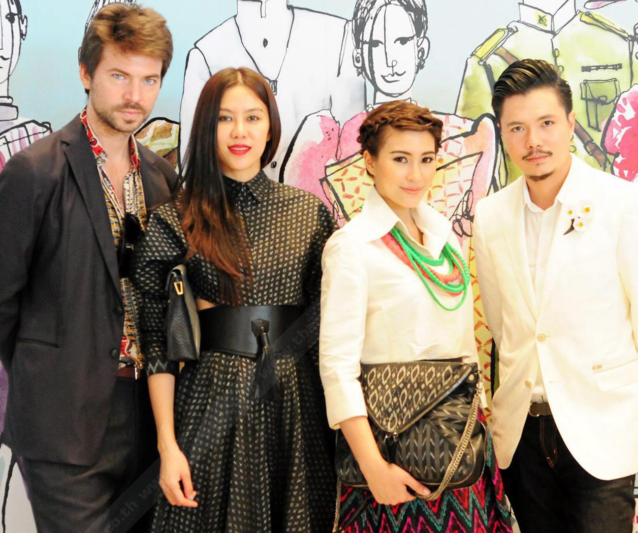 ปิยวรา ทีขะระ เนตรน้อย (ที่ 3 จากซ้าย) ชวนดีไซเนอร์ดัง มิลิน ยุวจรัสกุล (ซ้ายสุด) และศิริชัย ทหรานนท์ (ขวาสุด) ร่วมออกแบบแฟชั่นผ้าไทย.