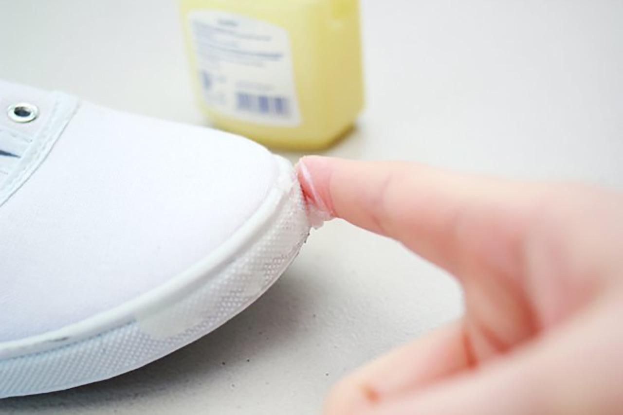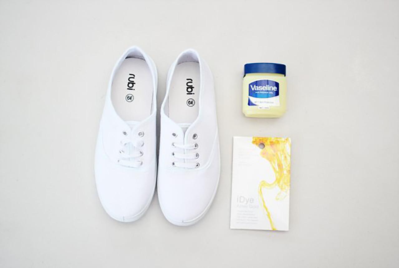 1. ขั้นตอนแรกเตรียมรองเท้าผ้าใบของคุณให้พร้อม และถอดเชือกรองเท้าออกด้วย หลังจากนั้นนำวาสลีนมาทาบริเวณยางรองเท้า(ตามภาพ) เพื่อป้องยางเปื้อนสีจากการย้อมสีผ้าใบ