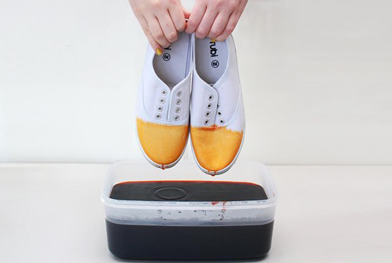 3.รีบจุ่มรองเท้าผ้าใบของคุณลงในสีที่เตรียมไว้จุ่มลงประมาณพื้นที่ 1 ใน 3 ของรองเท้า ดูความเข้ม-จางของสีที่เราจุ่มบนรองเท้าด้วย ถ้ารู้สึกว่ามันเข้มไปให้ใช้น้ำเปล่าช่วยเจือจางสี จนกว่าจะได้สีที่เราชอบ