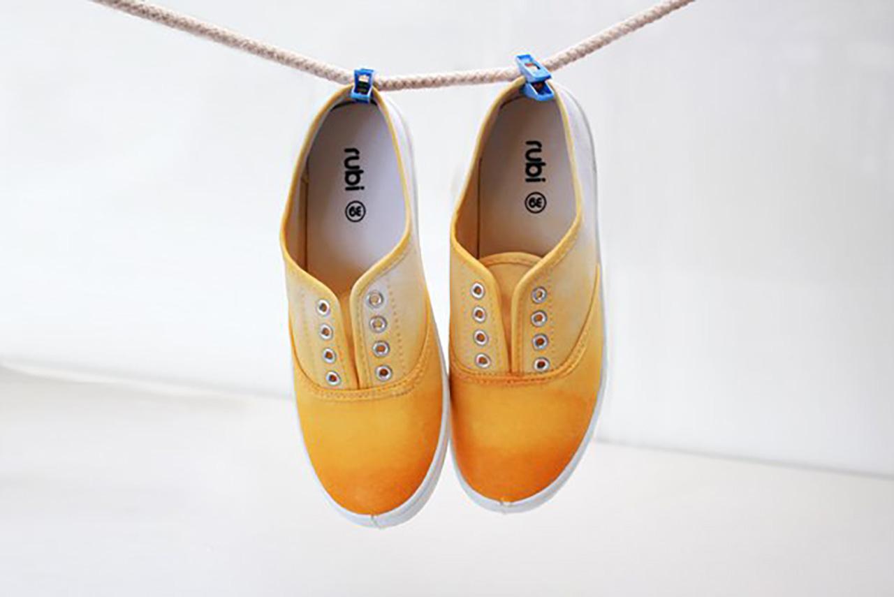 6.เมื่อคุณโอเคกับสีของรองเท้าแล้ว ให้นั่งรอห้านาทีแล้วนำน้ำมาล้างรองเท้า หลังจากนั้นก็แขวนไว้คืนนึงรอให้แห้ง