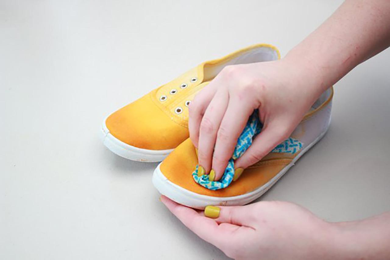 5.ใช้ผ้าชุบน้ำหมาดๆ และค่อยๆ ถูไล่สีจากหัวรองเท้าให้สวยงาม