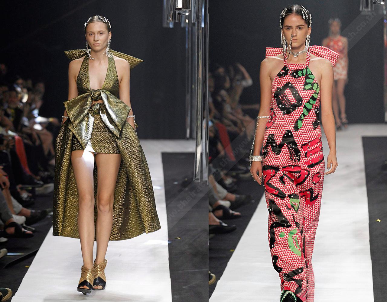 ส่วนแบรนด์ VATIT ITTHI เตรียมขึ้นแท่นเป็นกูตูริเยร์น้อยของเมืองไทยในอนาคต ด้วยความพิถีพิถันของงานช่างฝีมือชั้นสูง งานนี้แบรนด์น้องใหม่แกะกล่อง THE ONLY SON ก็เปิดตัวสวยงาม โดยอุทิศคอลเลกชั่นให้ศิลปินชื่อดังชาวเยอรมันจากยุค 70 “Joseph Beuys” ซึ่งกล้าวิพากษ์วิจารณ์สังคมและการเมืองอย่างเปิดเผย สร้างจุดเด่นด้วยการใช้ผ้าดับเบิ้ลเฟซสองสี, การอัดพลีท, การเย็บปักผ้า และเทคนิคการสร้างช่องนูน 3 มิติ เลียนแบบจากช่องกระสุนของเครื่องแบบทหาร.