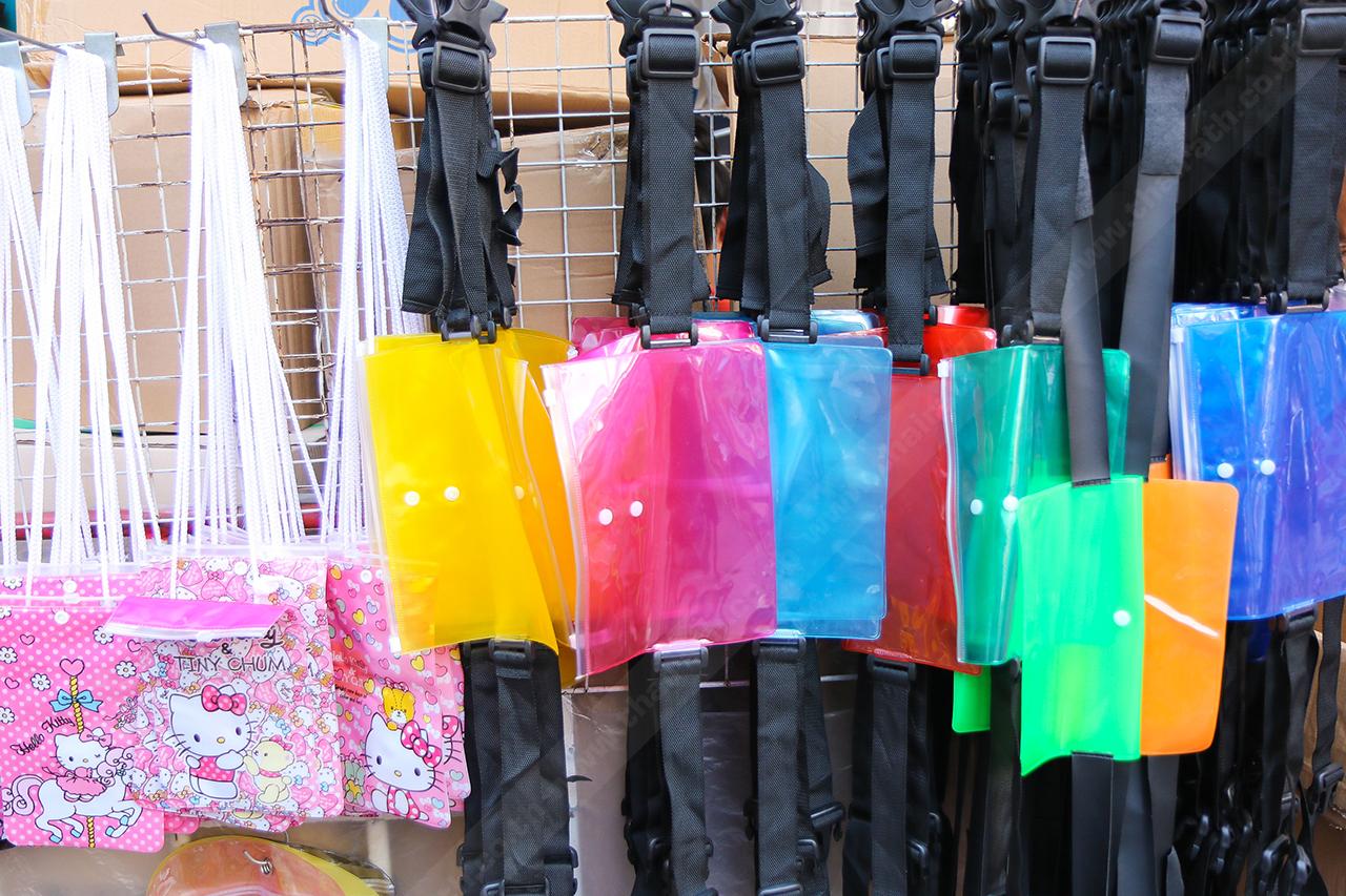 ถือว่าเป็นอุปกรณ์ที่สำคัญเลย เพราะเวลาเราเดินทางไปไหนช่วงวันสงกรานต์ คุณต้องเปียกแน่ๆ กระเป๋ากันน้ำนี่แหละตัวช่วยสำคัญ สามารถใส่ของจุกจิกๆ ของคุณได้ มีสีสันที่สดใส น่ารักเก๋ไก๋ หลากหลายรูปแบบ ถือเก๋ๆ ไม่ซ้ำใคร สนนราคาอยู่ที่ 60-100 บาท