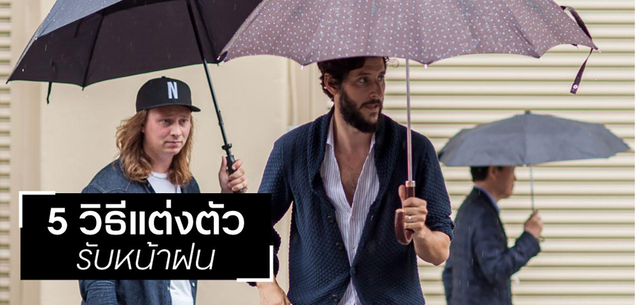 เมื่อถึงหน้าฝนทีไร ผู้ชายแต่งตัวจัดคงต้องหน้านิ่วคิ้วขมวด พลางนึกในใจว่าจะแต่งตัวอย่างไรดี หรือจะต้องไปรื้อตู้เสื้อผ้าหาไอเท็มที่สามารถรับมือกับหน้าฝนได้อย่างเต็มที่ เพราะคุณก็รู้ว่าฟ้าฝนมักมาไม่ตรงเวลา บางครั้งคุณใส่สูทหล่อเนี้ยบ รองเท้าหนังขัดมัน เดินอยู่กลางเมือง เอ้า! สักพักฝนตกกระหน่ำลงมา หมดหล่อกันละคราวนี้ แถมสูทกับรองเท้าหนังของคุณก็โดนน้ำไปเต็มๆ เสียดายเลยนะนั่น แต่อย่าห่วงไปเลย เรามี 5 วิธีแต่งตัวรับหน้าฝน ลองหาดูว่าในหน้าฝนนี้คุณควรเลือกไอเท็มแบบไหน