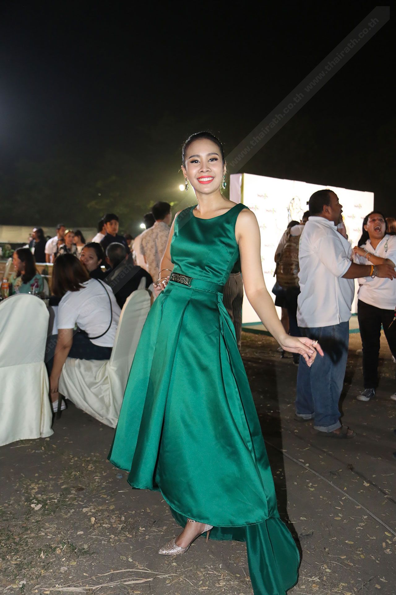 ถัดมากับนักร้องเสียงดีจากอาร์เอส “พ้อย-พรวรา” ชุดของเธอสีสันสดใสเขียวน้ำทะเล ขับให้ผิวของเธอดูผ่องยิ่งขึ้น
