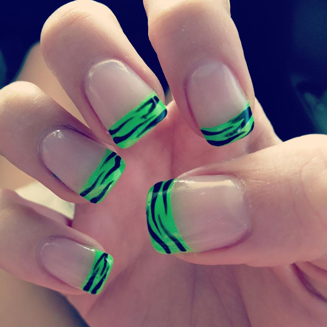 สุดท้ายเปลี่ยนการทาเล็บแบบเดิมๆ ให้สนุกมากขึ้น จากที่คุณเคยทาทั้งเล็บ ย้ำสีหลายๆ รอบ (ซึ่งสีนีออนมันอาจแรงไปสำหรับใครหลายคน) วิธีการที่สุดแสนจะเฉย และธรรมดา จะดีกว่าไหม ถ้าลองเปลี่ยนมาทำสไตล์ French Nail ดูบ้าง โดยการทาสีนีออนแค่ช่วงปลายเล็บเท่านั้น เล่นได้หลากหลายสารพัดสี หรือคุณจะทาสลับสีกันก็ได้ เช่น สีขาวสลับสีดำ หรือสีดำสลับสีชมพู ก็เก๋ไก๋เอาอยู่ จากนั้นลงน้ำยาเคลือบเล็บทับอีกที ก็เพิ่มความแนวให้สาวๆ กันมากกว่าเดิมแล้วล่ะ