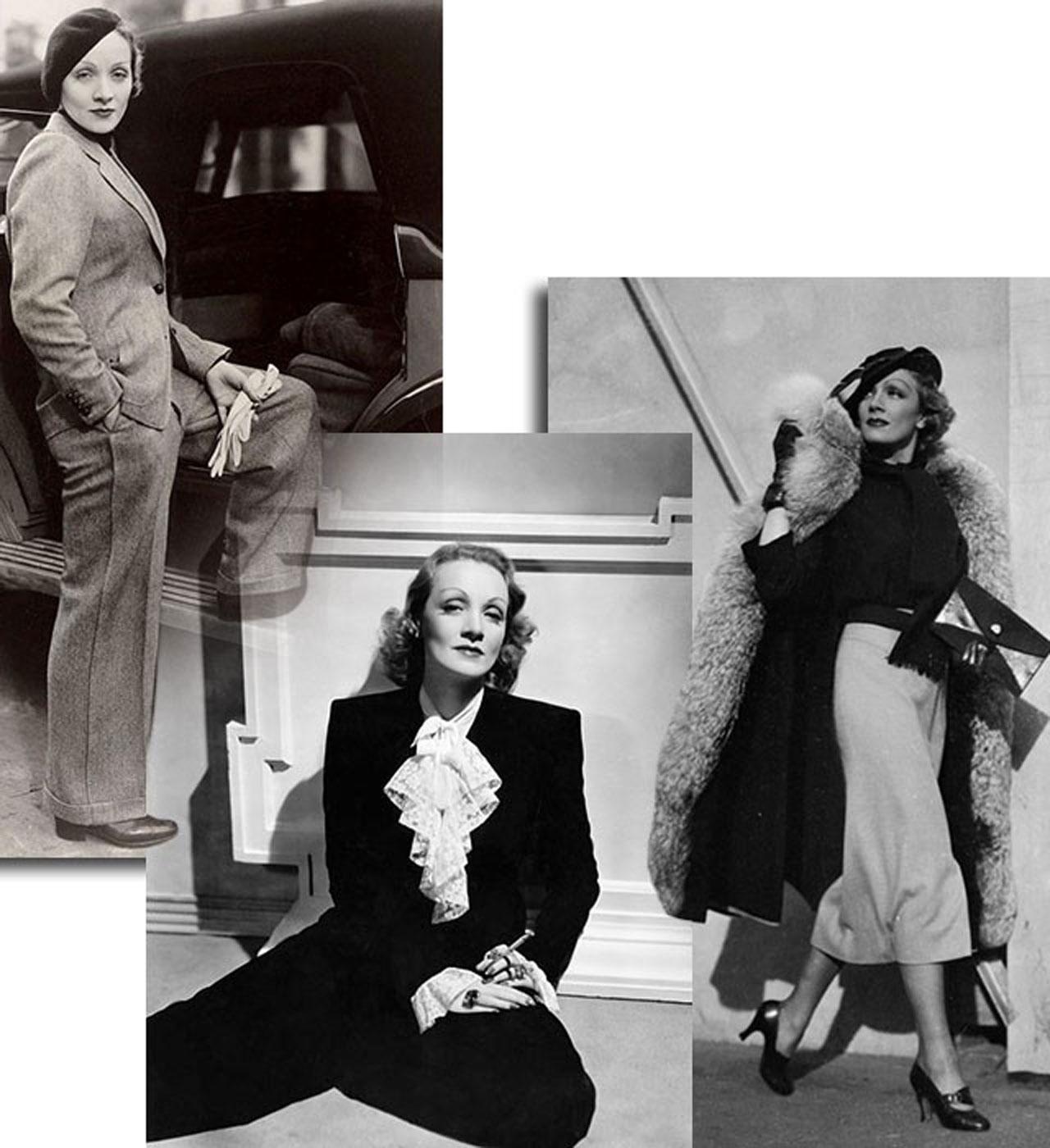 1. Marlene Dietrich คือหญิงสาวคนแรกๆ ในยุค 30 ที่สวมชุดสูททักซิโดเต็มรูปแบบเข้าสังคม ซึ่งถือเป็นสิ่งที่ค่อนข้างขัดกับลุคผมลอนสีบลอนด์สั้นของเธอในตอนนั้น อีกทั้งเธอยังเลือกสวมไทกับสูทเบรเซอร์ตัวโคร่งพร้อมกระโปรงและปิดท้ายด้วยเฟอร์ยาวพาดไหล่อีกต่างหาก การหยิบเสื้อผ้าของเพศตรงข้ามมาใช้ในการแต่งกายของเธอจึงเป็นการเปิดมุมมองใหม่ให้กับคนสมัยนั้น