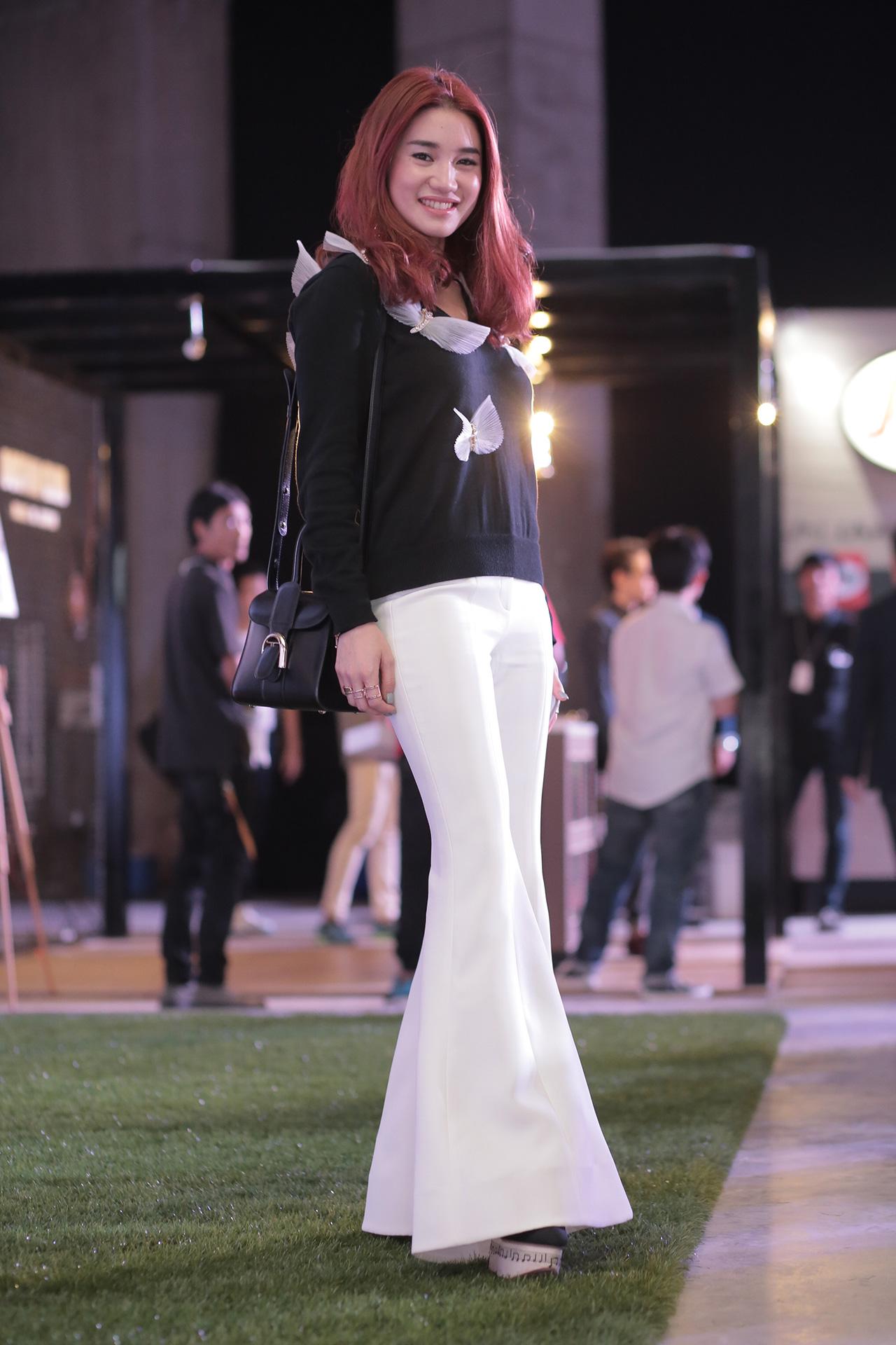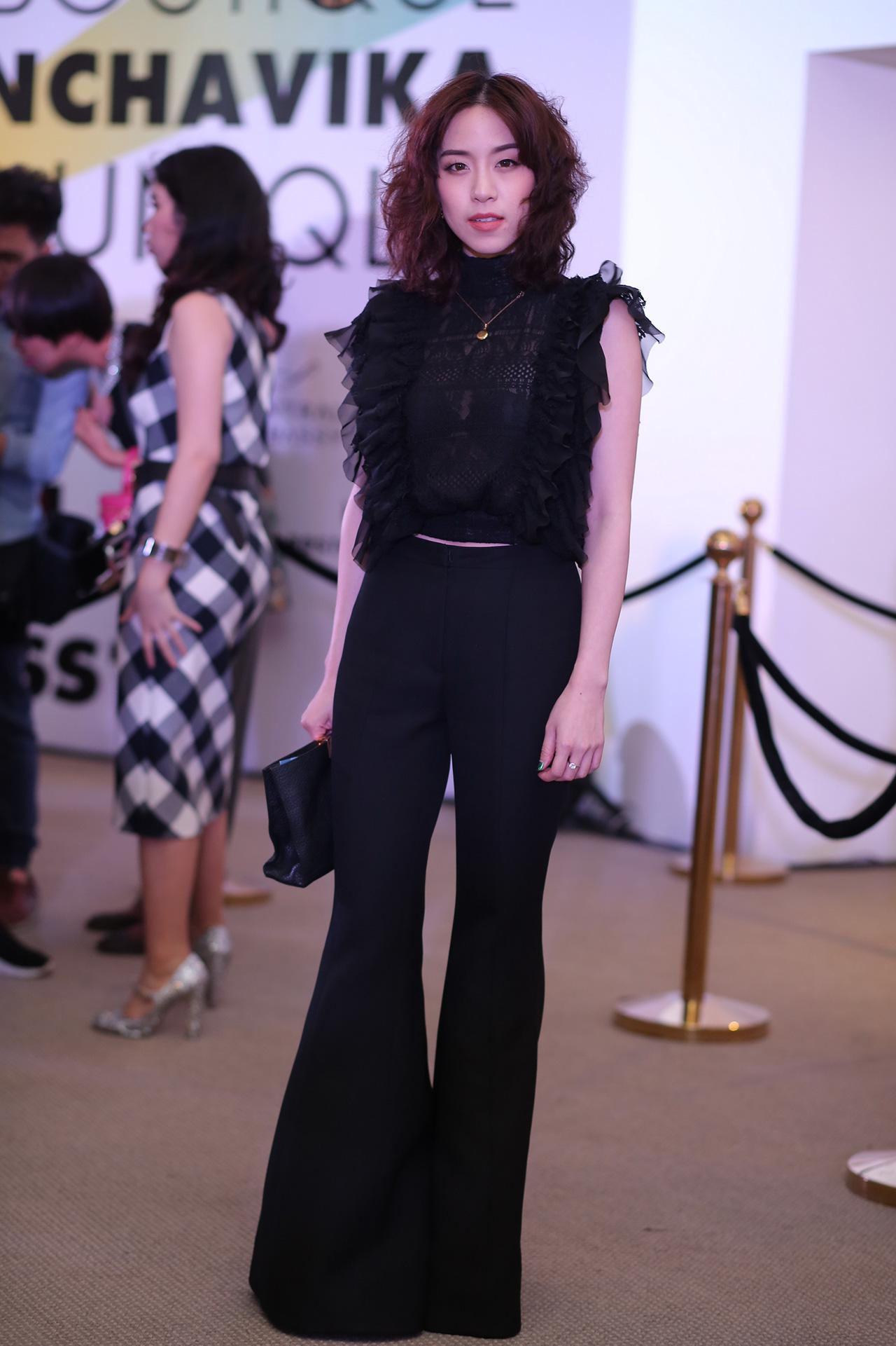 ‘พลอย หอวัง’ มาในชุดสีดำมีความฟรุ้งฟริ้ง มีระบายตรงเสื้อเบาๆ ยังคงความเก๋แบบแฟชั่นไอคอนด้วยกางเกงเอวสูงทรงขาม้า ที่กำลังเป็นที่นิยมอยู่ในตอนนี้